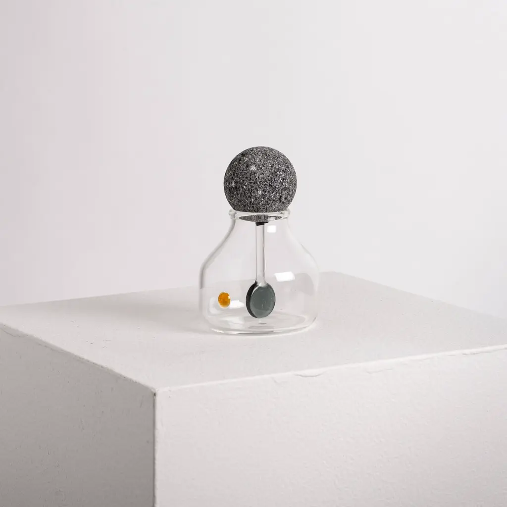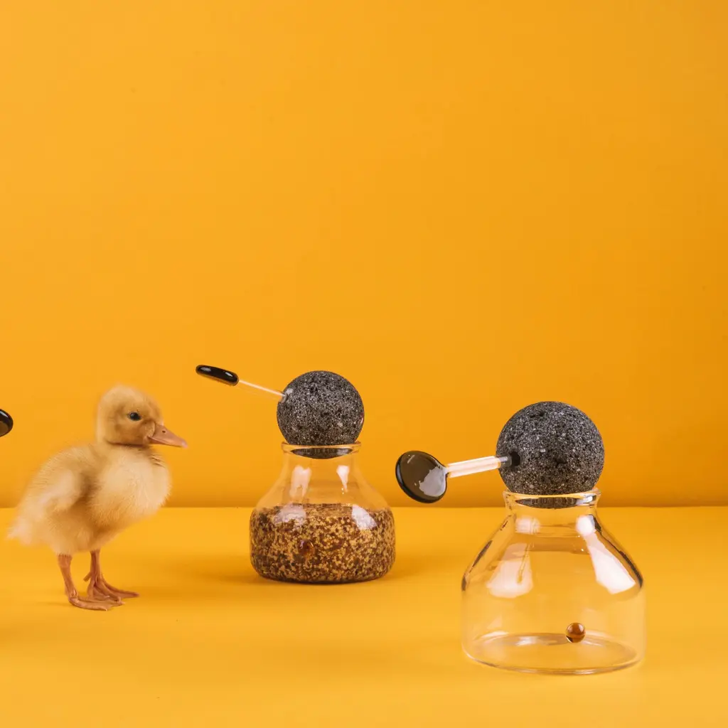 This is a handmade borosilicate glass container. The sphere, available in black, white marble, or lava stone, works both as a lid and as part of the scoop. This container is perfect for your table, add your favorite dressing, and use it in any of your meals.