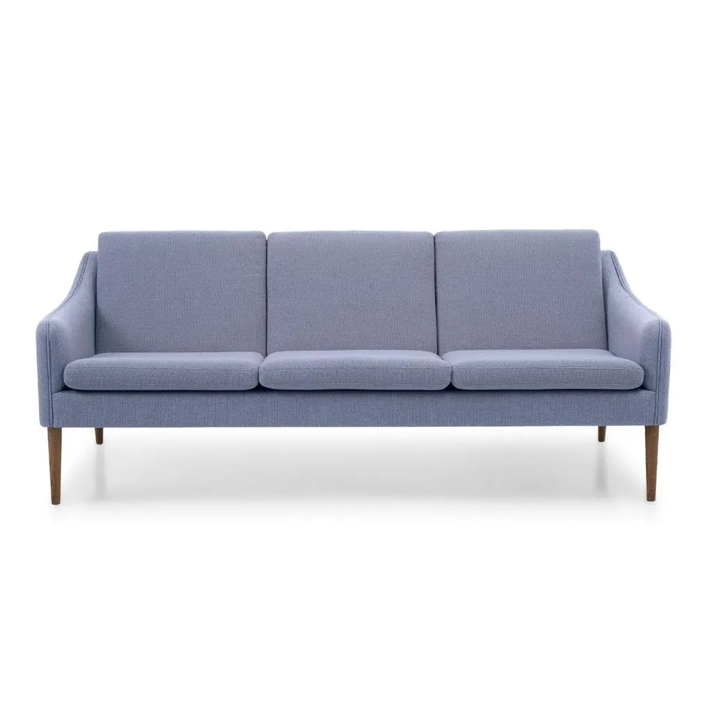 Mr Olsen 3 seater oak soft violet by Warm NordicDimensions: D201 x W79 x H 78/46 cmMaterial: Textile upholstery, Foam, Spring system, Solid oiled oak legs, Solid smoked oak legsWeight: 50 kgAlso available in different colours and finishes. A classic, sophisticated designer sofa designed in the 1950s by the highly acclaimed Danish architect, Hans Olsen. The sofa is now available in an exclusive anniversary edition with sustainable textiles launched on the occasion of Hans Olsen's 100th anniversary. The Mr Olsen sofa is an original design that is a perfect match for a gentleman's room or a feminine sofa group, in a home office or a holiday cottage: anywhere that classic furniture design makes all the difference. Mr Olsen is both slender and organic with a lightness that is unusual by comparison with other design classics of the period. Mr Olsen's special elegance derives particularly from the soft shapes of the sofa's armrests and the round, tapered legs. The sofa is available both in a classic leather version and a fully upholstered version in beautiful fabrics, including sophisticated velour for a more daring look. Choose from several different exclusive furnishing fabrics from the likes of Kvadrat in a variety of classic colours from the Warm Nordic universe. The frame is available in the highest quality walnut, oiled oak, or smoked oak. The anniversary edition of the Mr Olsen sofa is two-toned with a lively, yet elegant expression covered in two different sustainable fabrics from Kvadrat. The sofa comes in a light purple version in Re-wool from Kvadrat and a peach version in Merit by Maharam, both of which excel in sustainability, sensuosity and quality. The frame on the anniversary sofa is constructed of FSC-certified wood.Warm Nordic is an ambitious design brand anchored in Nordic design history and with a timeless, aesthetic style that inspires you to appreciate the little things in life. The company is the result of several years’ intense work on developing a new design brand with design history, quality and personality at its core. Warm Nordic boasts a colourful and charming universe of furniture, lamps and accessories full of personality. Our designs encapsulate the Nordic spirit, which in its essence is timeless, inclusive and warm.