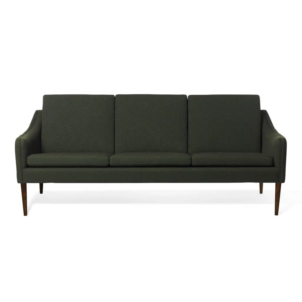 Mr Olsen 3 seater walnut dark green by Warm NordicDimensions: D201 x W79 x H 78/46 cmMaterial: Textile upholstery, Foam, Spring system, Walnut, Solid oiled oak legs, Solid smoked oak legsWeight: 50 kgAlso available in different colours and finishes.A classic, sophisticated designer sofa designed in the 1950s by the highly acclaimed Danish architect, Hans Olsen. The sofa is now available in an exclusive anniversary edition with sustainable textiles launched on the occasion of Hans Olsen's 100th anniversary. The Mr Olsen sofa is an original design that is a perfect match for a gentleman's room or a feminine sofa group, in a home office or a holiday cottage: anywhere that classic furniture design makes all the difference. Mr Olsen is both slender and organic with a lightness that is unusual by comparison with other design classics of the period. Mr Olsen's special elegance derives particularly from the soft shapes of the sofa's armrests and the round, tapered legs. The sofa is available both in a classic leather version and a fully upholstered version in beautiful fabrics, including sophisticated velour for a more daring look. Choose from several different exclusive furnishing fabrics from the likes of Kvadrat in a variety of classic colours from the Warm Nordic universe. The frame is available in the highest quality walnut, oiled oak, or smoked oak. The anniversary edition of the Mr Olsen sofa is two-toned with a lively, yet elegant expression covered in two different sustainable fabrics from Kvadrat. The sofa comes in a light purple version in Re-wool from Kvadrat and a peach version in Merit by Maharam, both of which excel in sustainability, sensuosity and quality. The frame on the anniversary sofa is constructed of FSC-certified wood.Warm Nordic is an ambitious design brand anchored in Nordic design history and with a timeless, aesthetic style that inspires you to appreciate the little things in life. The company is the result of several years’ intense work on developing a new design brand with design history, quality and personality at its core. Warm Nordic boasts a colourful and charming universe of furniture, lamps and accessories full of personality. Our designs encapsulate the Nordic spirit, which in its essence is timeless, inclusive and warm.