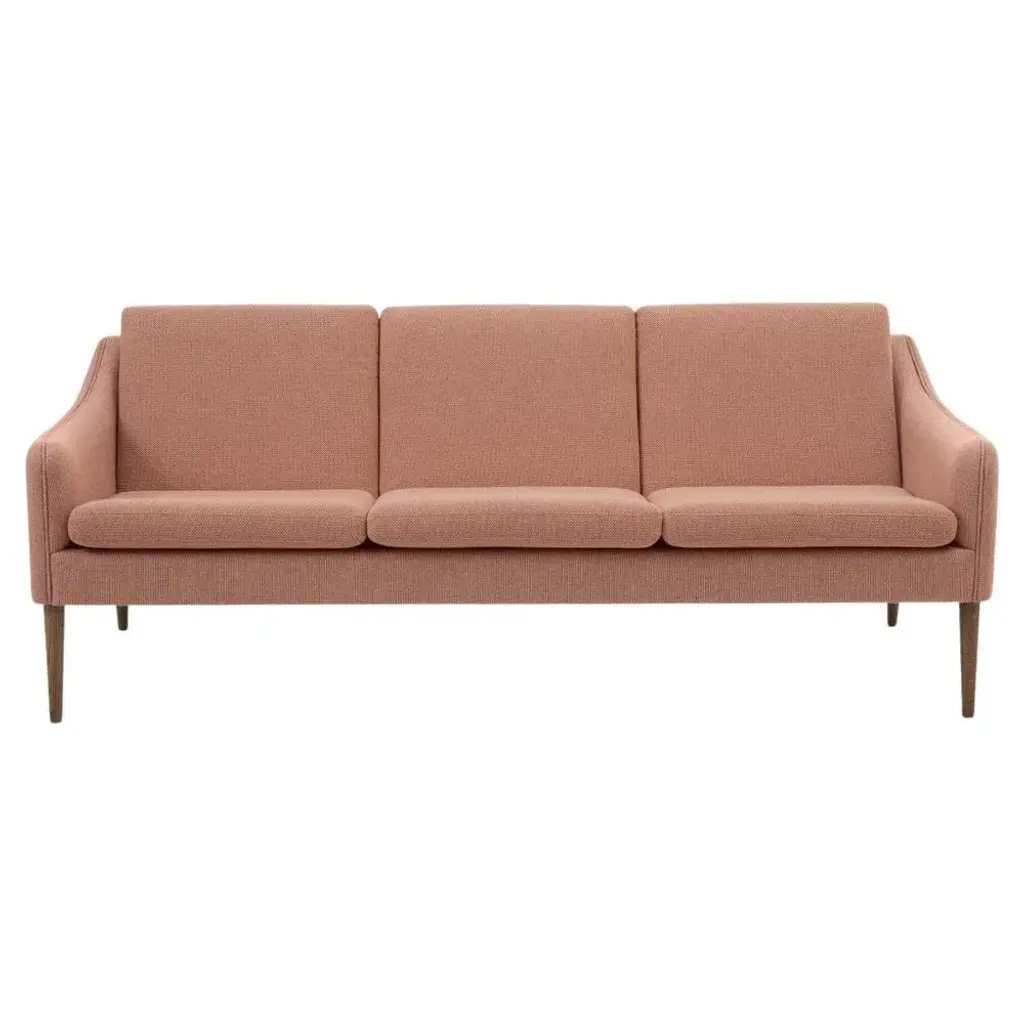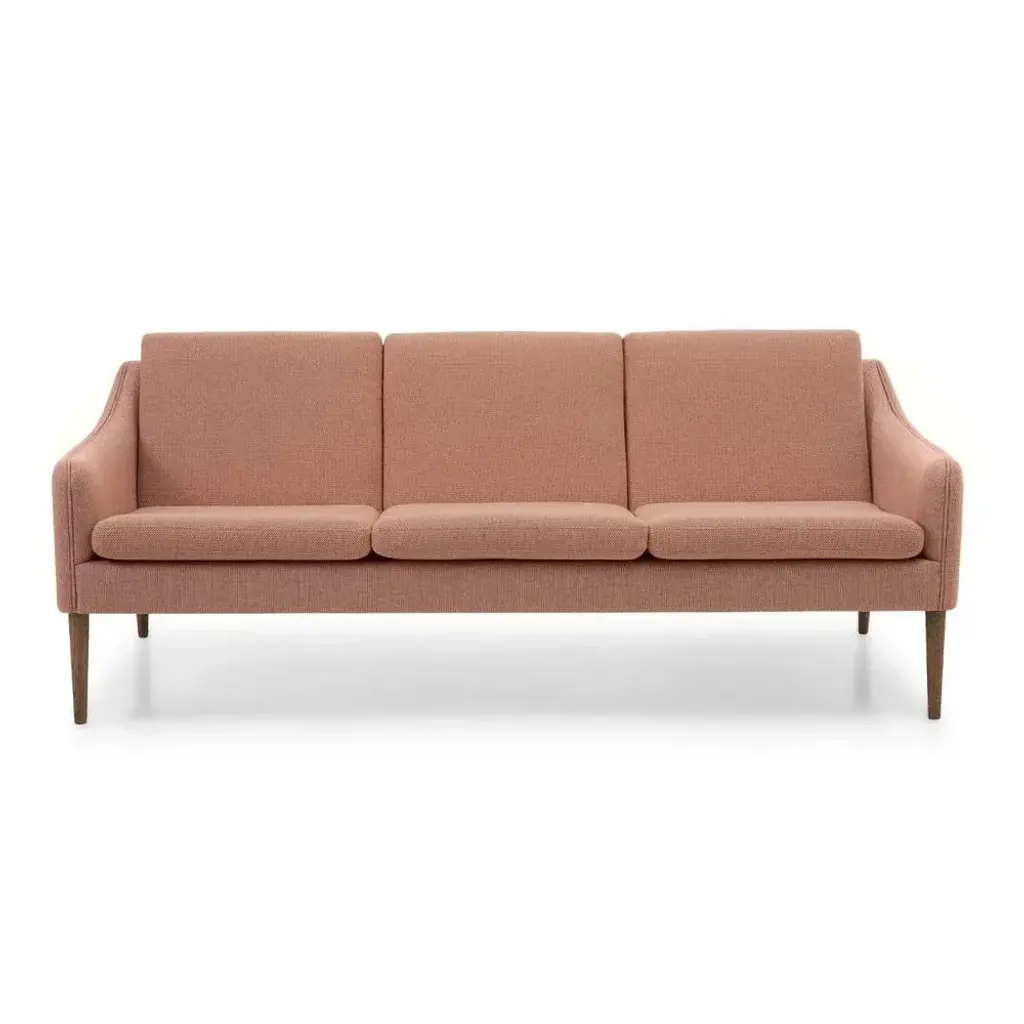 Mr olsen 3 seater oak fresh peach by warm nordic dimensions: d201 x w79 x h 78/46 cm material: textile upholstery, foam, spring system, solid oiled oak legs, solid smoked oak legs weight: 50 kg may be available separately in different colours and finishes. Please contact us. A classic, sophisticated designer sofa designed in the 1950s by the highly acclaimed danish architect, hans olsen. The sofa is now available in an exclusive anniversary edition with sustainable textiles launched on the occasion of hans olsen's 100th anniversary. The mr olsen sofa is an original design that is a perfect match for a gentleman's room or a feminine sofa group, in a home office or a holiday cottage: anywhere that classic furniture design makes all the difference. Mr olsen is both slender and organic with a lightness that is unusual by comparison with other design classics of the period. Mr olsen's special elegance derives particularly from the soft shapes of the sofa's armrests and the round, tapered legs. The sofa is available both in a classic leather version and a fully upholstered version in beautiful fabrics, including sophisticated velour for a more daring look. Choose from several different exclusive furnishing fabrics from the likes of kvadrat in a variety of classic colours from the warm nordic universe. The frame is available in the highest quality walnut, oiled oak, or smoked oak. The anniversary edition of the mr olsen sofa is two-toned with a lively, yet elegant expression covered in two different sustainable fabrics from kvadrat. The sofa comes in a light purple version in re-wool from kvadrat and a peach version in merit by maharam, both of which excel in sustainability, sensuosity and quality. The frame on the anniversary sofa is constructed of fsc-certified wood.