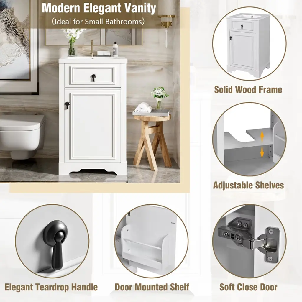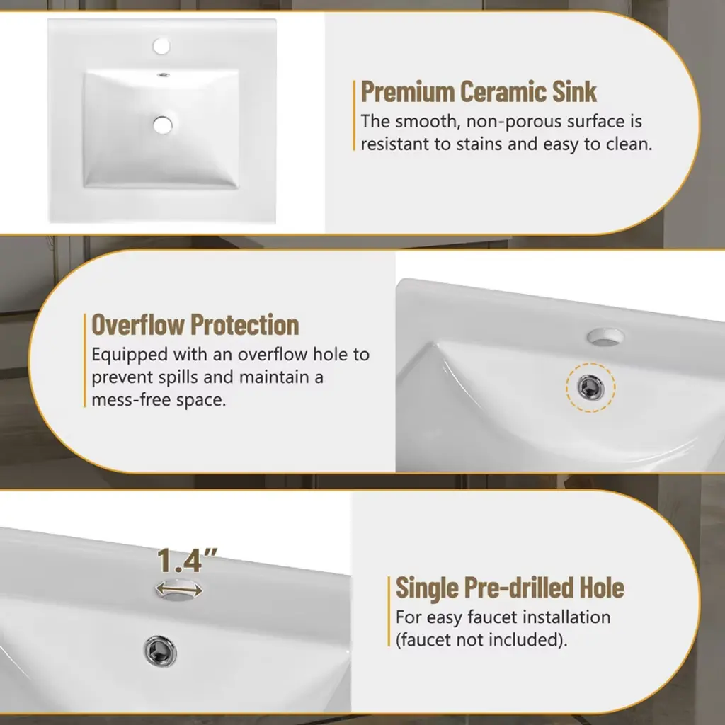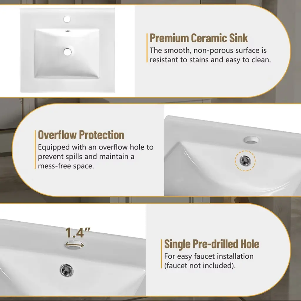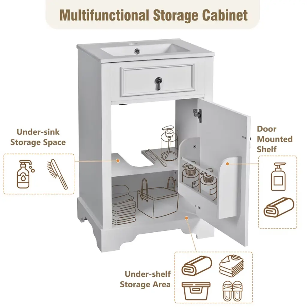 Product Introduction This 20-inch bathroom vanity is a stylish and compact solution for smaller bathrooms. With its sleek ceramic sink, soft-close door, and flexible storage options—including an adjustable shelf and door-mounted rack—this piece combines practical functionality with vintage-inspired charm. Made from a solid wood frame and MDF, it delivers lasting durability and timeless elegance. Product Features Perfect for Small Bathrooms – Measuring just 20 inches wide, this vanity is designed to save space while delivering essential storage and style. Durable Ceramic Sink – Easy to clean with a sleek finish, the high-quality ceramic sink offers lasting performance and refined aesthetics. Built-in Overflow Hole – Prevents water from spilling, helping to keep your bathroom dry and safe. Sturdy Construction – Made with a solid wood frame and MDF panels for long-term durability and stability. Adjustable Shelf & Door Rack – Interior adjustable shelf and door-mounted storage rack provide flexible organization for various bathroom items. Faux Drawer Accent – A decorative faux drawer adds visual interest while maintaining a minimalist profile. Soft-Close Door – Enjoy a quiet, smooth closing experience that eliminates slamming and adds comfort to your daily routine. Vintage-Inspired Handle – Aluminum alloy handle with a classic look adds a charming and stylish detail. Easy Two-Person Assembly – Includes all necessary hardware and instructions for a quick and simple setup. Specifications Overall Dimensions: 20"W x 18"D x 34"H Sink Dimensions: 20"W x 18"D x 6.7"H Vanity Cabinet Dimensions: 19.72"W x 17.91"D x 33.27"H Weight: Total 67.24 lbs (Sink: 23.9 lbs, Cabinet: 43.34 lbs) Weight Capacity: Overall: 110 lbs; Shelf Divider: 22 lbs Style: Modern Mounting Type: Free-standing Sink Material: Ceramic Cabinet Material: Solid Wood + MDF Handle Material: Aluminum Alloy Finish Type: Painted Finish Sink Type: Undermount / Drop-in Sink Shape: Rectangular Faucet Mount Type: Single Hole (Faucet Not Included) Overflow Hole: Yes Vanity Top Edge Type: Flat, Edge Thickness: 0.6" Number of Doors: 1 Adjustable Shelves: Yes Soft-Close Hinges: Yes Assembly: Required Note This product includes the vanity cabinet, ceramic sink, installation hardware, and manual. Faucet and drain are not included. Two-person assembly is recommended for best results.