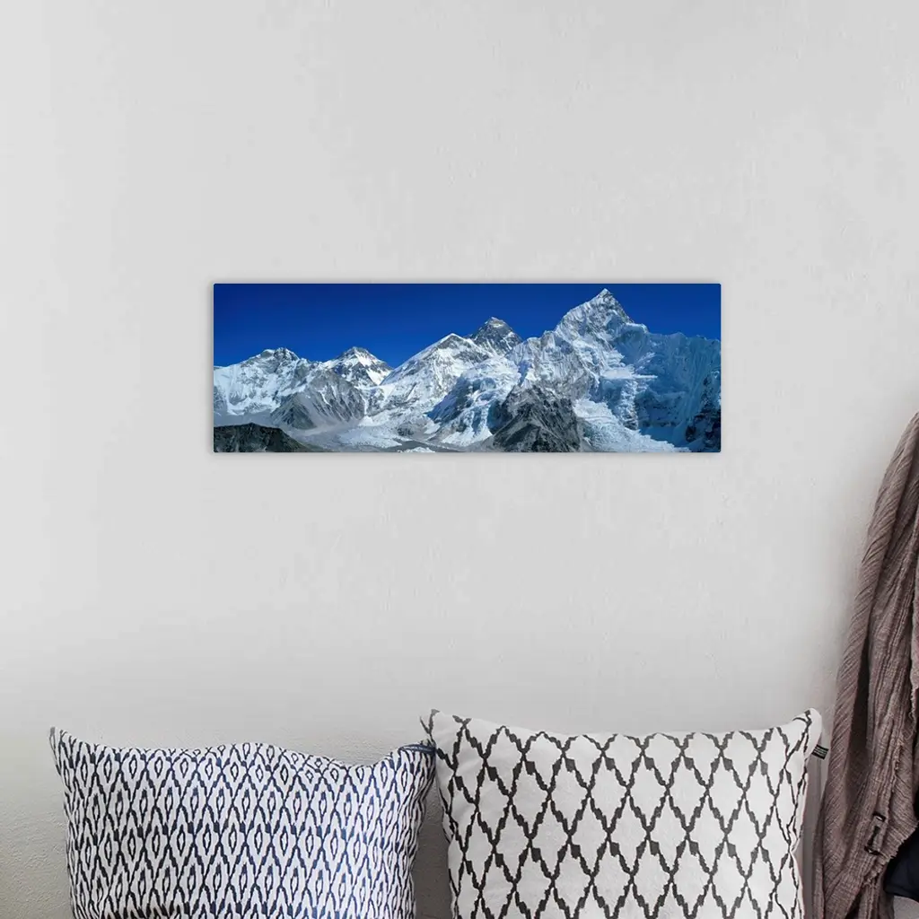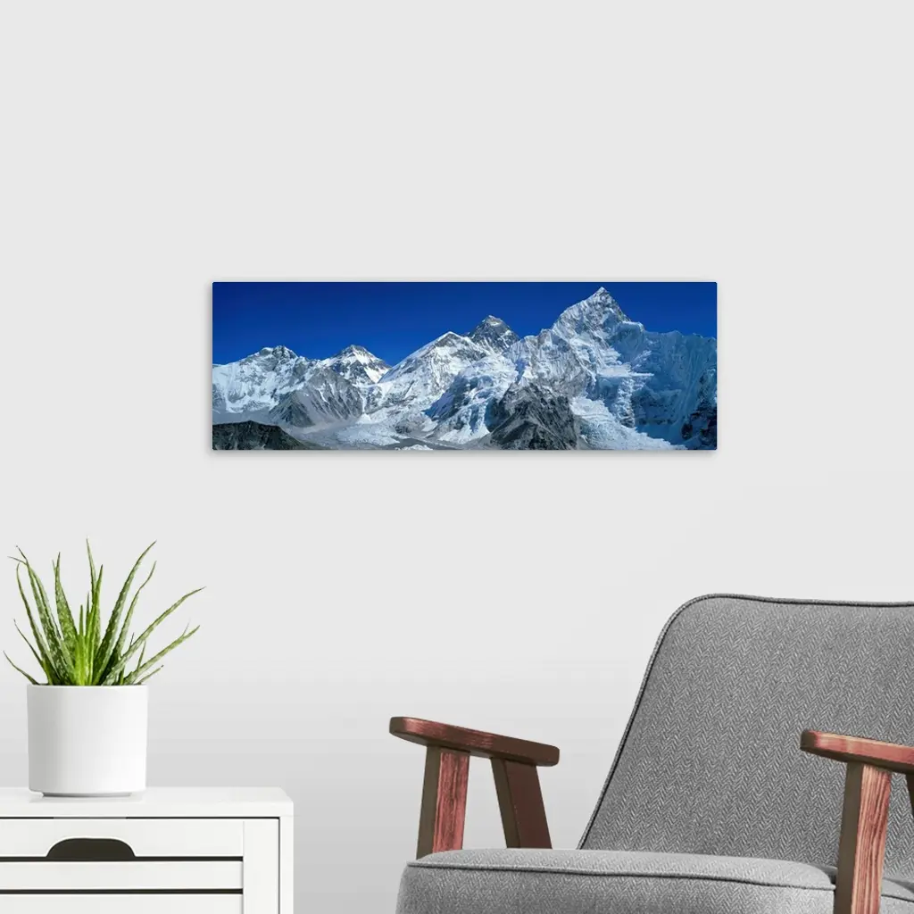 Giant, wide angle landscape photograph of snow covered Himalaya Mountains against a blue sky, including Mt Chungsi, Mt Everest, and Mt Nuptsi, in the Khumbu Region of Nepal.