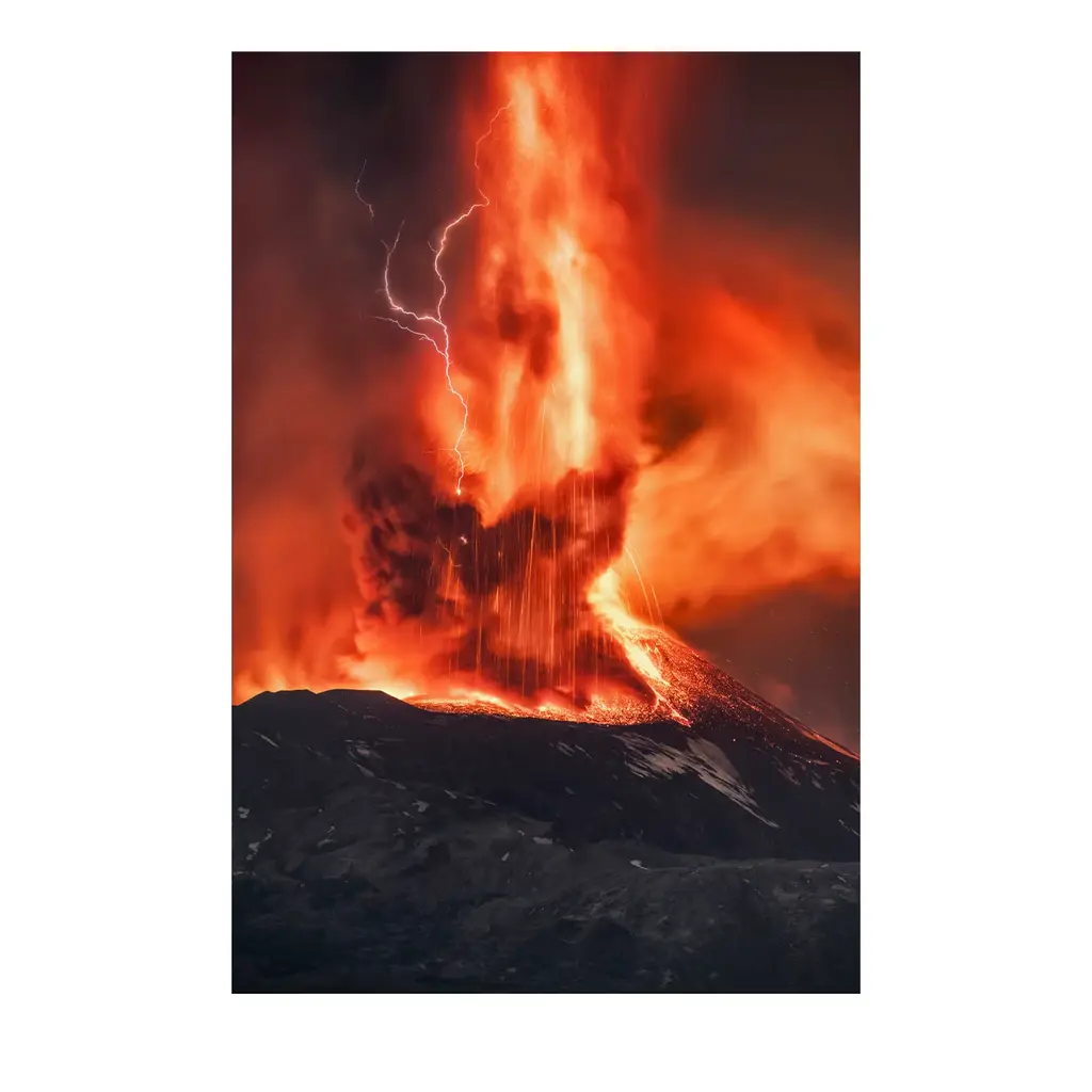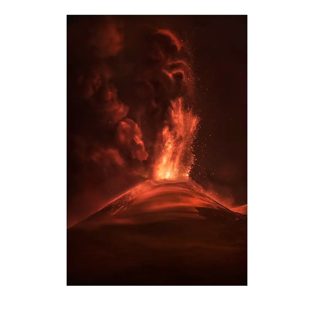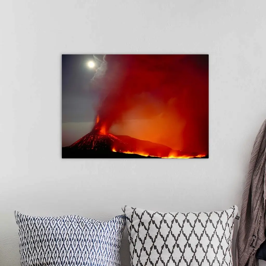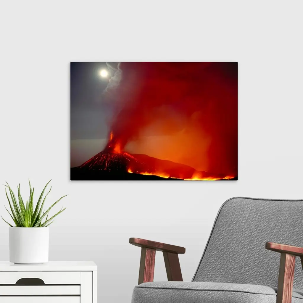 Fine art photo of a volcano erupting and spewing ash into the night sky.