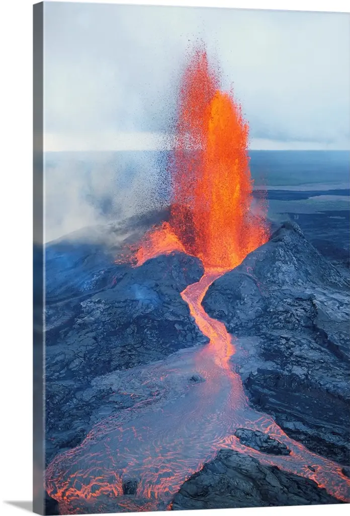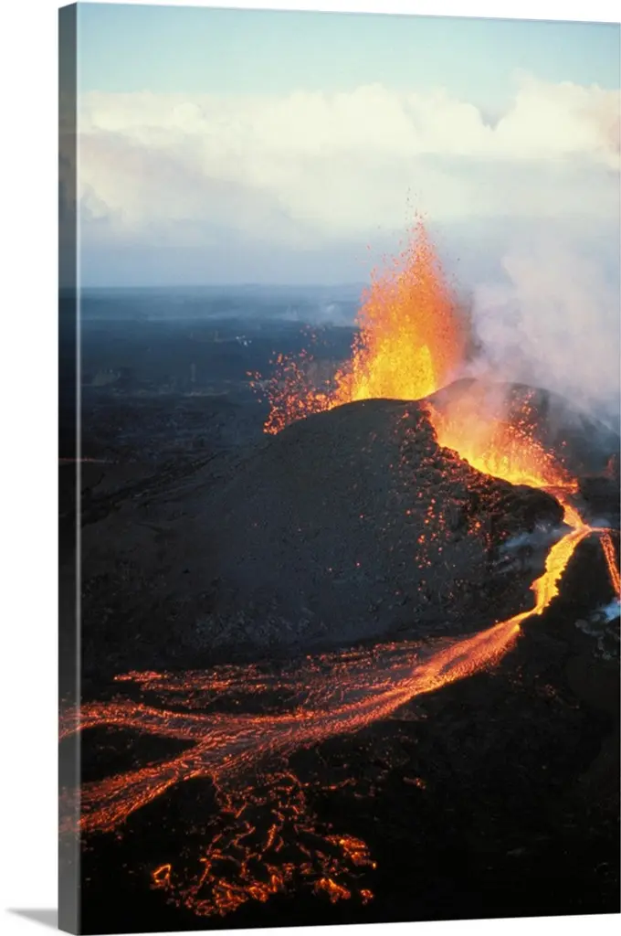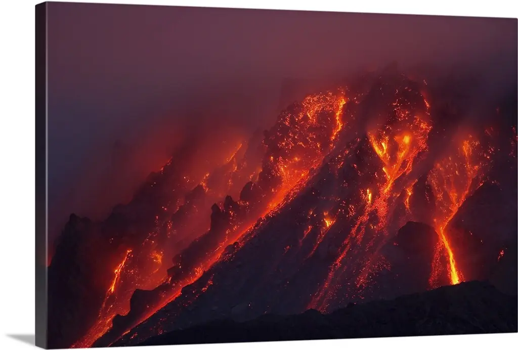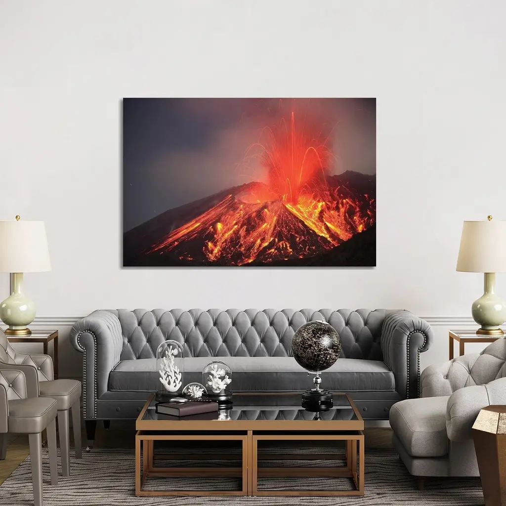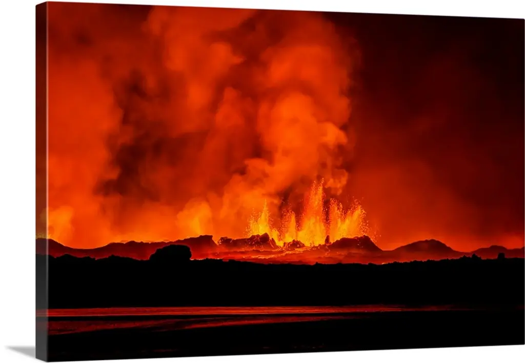 Fine art photo of a volcano erupting and spewing ash into the night sky.