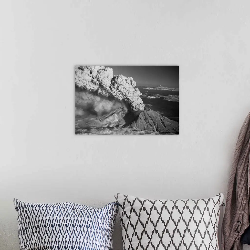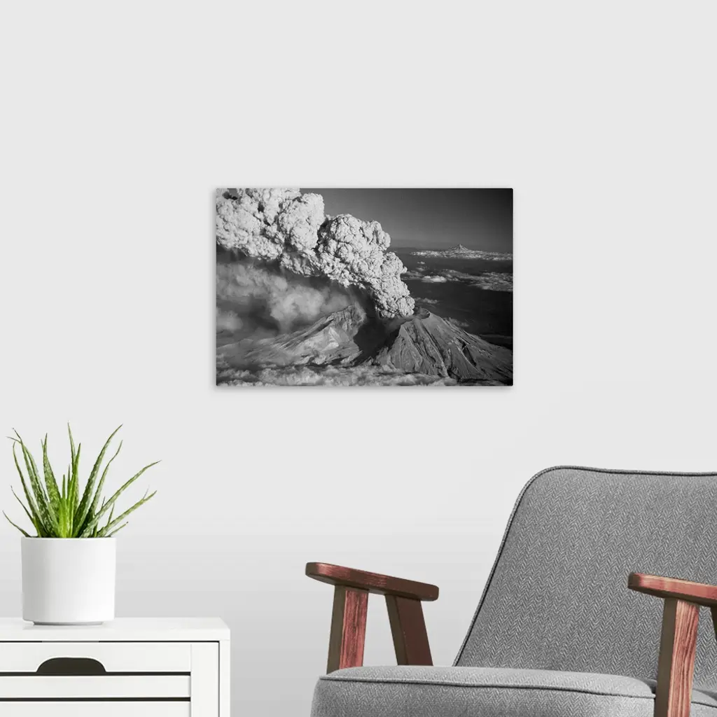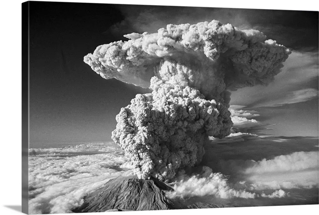 BLOWS TOP AGAIN. SPIRIT LAKE,WASH.: WITH MOUNT HOOD (RIGHT,REAR) VISIBLE IN THE BACKGROUND, MOUNT ST.HELENS ERUPTS JULY 22. THE PLUME OF STEAM AND ASH ROSE SOME 60,000 FEET IN THE AIR, SENDING ASH IN A NORTHEASTERLY DIRECTION. MOUNT ST.HELENS BROKE A SIX-WEEK SILENCE WITH A SERIES OF TOWERING ASH ERUPTIONS. JULY 29,1980. CREDIT:UPI JO/MAX GUTIERREZ