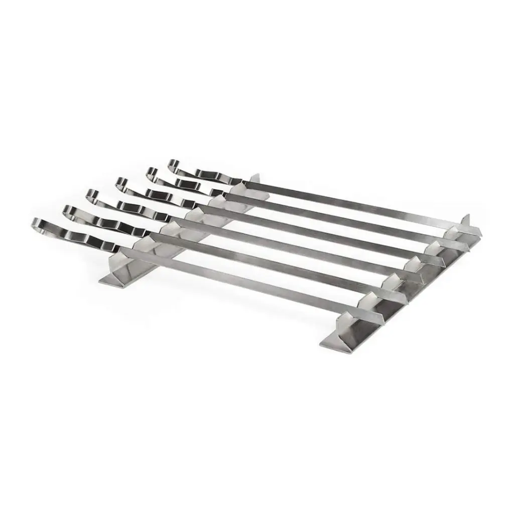 The Mtoye Steven Raichlen Best Of Barbecue Kabob Rack raises the skewer and kabob above the grate, enabling grate-less grilling on a conventional grill. The rack's design allows for complete and easy rotation of skewers so food cooks evenly on all sides and the notches in the rack hold the skewers steady without slipping or spinning.The set includes six flat, sturdy extra-wide skewers. Middle Eastern kofta kabobs, Central Asian seekh kabobs, chunks of beef or pork, fish, and even wet vegetables, like tomatoes and mushrooms, won't slip or spin as they do on thin conventional skewers. You can turn these skewers without worrying about losing food. And unlike ordinary skewers, these all-metal handles won't burn. Each skewer measures 3/8 inch wide by 17-inch long.Bundle Includes: