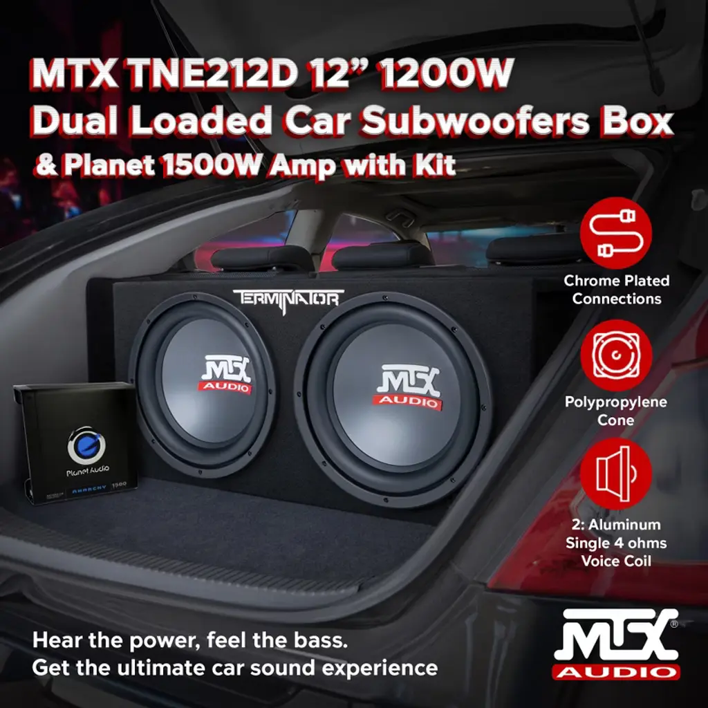 Enhance your car audio experience with the MTX Audio Terminator Series TNE212D. This exceptional fusion of premium subwoofer and enclosure design surpasses expectations, delivering unrivaled bass performance. The dual 12-inch sealed enclosure packs a punch with a commanding 1200 watts of maximum power, supported by a consistent 400-watt RMS. Prepare for an audio journey defined by powerful, deep bass that sets a new standard. This powerhouse includes subwoofers boasting a 2-inch aluminum single 2-ohm voice coil and a robust 48-ounce magnet. These components work in harmony to produce deep, crystal-clear bass. The subwoofers also incorporate Spider Plateau Venting, a mechanical cooling method ensuring continuous air circulation for effective heat dissipation. With enough power to take your car audio to the next level, this Planet Audio mono amp can handle 1500 watts of max power, and 563 or 1125 watts of RMS power. It features a continuously variable low pass crossover, low-level inputs and outputs, power and protection LEDs, heavy-duty set-screw style terminals, and chrome-plated connections. The 8 Gauge amplifier installation kit has everything you need to install your amplifier in your car. Each amp kit features a 20 foot 8 gauge red power cable, competition high-quality fuse holder, 3 feet of 8 gauge black ground cable, 16 feet of 18 gauge blue turn-on wire, a 20-foot high-performance RCA interconnect, 30 feet of speaker wire, 20, 4-inch wire ties, 3, rubber grommets, a Number 10 ring terminal, a 5/16 inch ring terminal, and a 1/4 inch ring terminal.