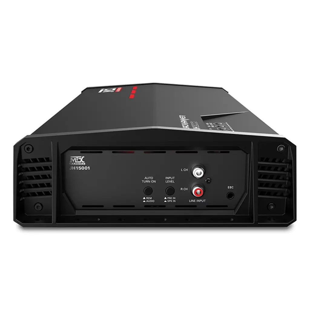 MTX JH15001 Jackhammer Series 1500 Watt Monoblock Subwoofer Amplifier Easy Access Controls Accessing the fully adjustable gain, low pass filter, subsonic filter and bass boost from the front panel allows for easy adjustment after the unit is installed. This layout is simple and elegant, giving the JH15001 a sophisticated look with the convenience of easy accessibility. Only What You Need The JH15001 is designed for one thing, bringing the power to whatever subwoofers you hook it up to. The input section features high quality RCAs for easy connection to after market head units or processors. The Input Level selection is either Pre or Spk In so it can also be used with factory radios that don't have RCA outputs. The Auto Turn On feature is selectable, enabling the unit to turn on when it senses signal, eliminating the need to run a remote wire, or it can be turned on using a remote wire, the choice is yours. High Quality Power and Speaker Connections The JH15001 can accept up to a standard 1/0-gauge power and ground wire for optimal performance. The speaker terminals can accept up to 12-gauge speaker. The speaker connection terminal has two sets of positive and negative terminals for easy wiring, the JH15001 can play loads down to 1Ω. Both sets of connectors use set screw style fittings that ensure proper connection and continual signal transfer. FEATURES • Variable Subsonic Filter • Top Mount Controls • Variable Crossovers • Selectable Turn On Input • Selectable Input Signal • Remote Bass Knob SPECIFICATIONS • Description: Mono Block • Topology: Class D • 4Ω RMS Power Output: 650W x 1 Channel • 2Ω RMS Power Output: 1100W x 1 Channel • 1Ω RMS Power Output: 1650W x 1 Channel • Signal to Noise Ratio: 68dB • Frequency Response: 20Hz - 250Hz • Crossover: 40Hz to 250Hz, 12dB/Oct • Subsonic Filter: 20Hz to 50Hz, 12dB/Oct • Bass Boost: 0 - 12dB @ 45Hz • Maximum Input Signal: 10V • Height: 2.57" (65.2mm) • Width: 7.61" (193.4mm) • Depth: 15.28" (388mm)