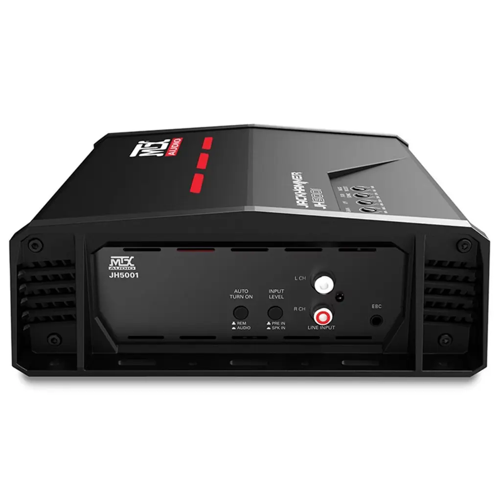 MTX JH5001 Jackhammer Series 500 Watt Monoblock Subwoofer Amplifier Easy Access Controls Accessing the fully adjustable gain, low pass filter, subsonic filter and bass boost from the front panel allows for easy adjustment after the unit is installed. This layout is simple and elegant, giving the JH5001 a sophisticated look with the convenience of easy accessibility. Only What You Need The JH5001 is designed for one thing, bringing the power to whatever subwoofers you hook it up to. The input section features high quality RCAs for easy connection to after market head units or processors. The Input Level selection is either Pre or Spk In so it can also be used with factory radios that don't have RCA outputs. The Auto Turn On feature is selectable, enabling the unit to turn on when it senses signal, eliminating the need to run a remote wire, or it can be turned on using a remote wire, the choice is yours. High Quality Power and Speaker Connections The JH5001 can accept up to a standard 1/0-gauge power and ground wire for optimal performance. The speaker terminals can accept up to 12-gauge speaker. The speaker connection terminal has two sets of positive and negative terminals for easy wiring, the JH5001 can play loads down to 1Ω. Both sets of connectors use set screw style fittings that ensure proper connection and continual signal transfer. FEATURES • Variable Subsonic Filter • Top Mount Controls • Variable Crossovers • Selectable Turn On Input • Selectable Input Signal • Remote Bass Knob SPECIFICATIONS • Description: Mono Block • Topology: Class D • 4Ω RMS Power Output: 225W x 1 Channel • 2Ω RMS Power Output: 375W x 1 Channel • 1Ω RMS Power Output: 550W x 1 Channel • THD: Less Than 1% • Signal to Noise Ratio: 72dB • Frequency Response: 20Hz - 250Hz • Crossover: 40Hz to 250Hz, 12dB/Oct • Subsonic Filter: 20Hz to 50Hz, 12dB/Oct • Bass Boost: 0 - 12dB @ 45Hz • Maximum Input Signal: 10V • Height: 2.57" (65.2mm) • Width: 7.61" (193.4mm) • Depth: 8.97" (228mm)
