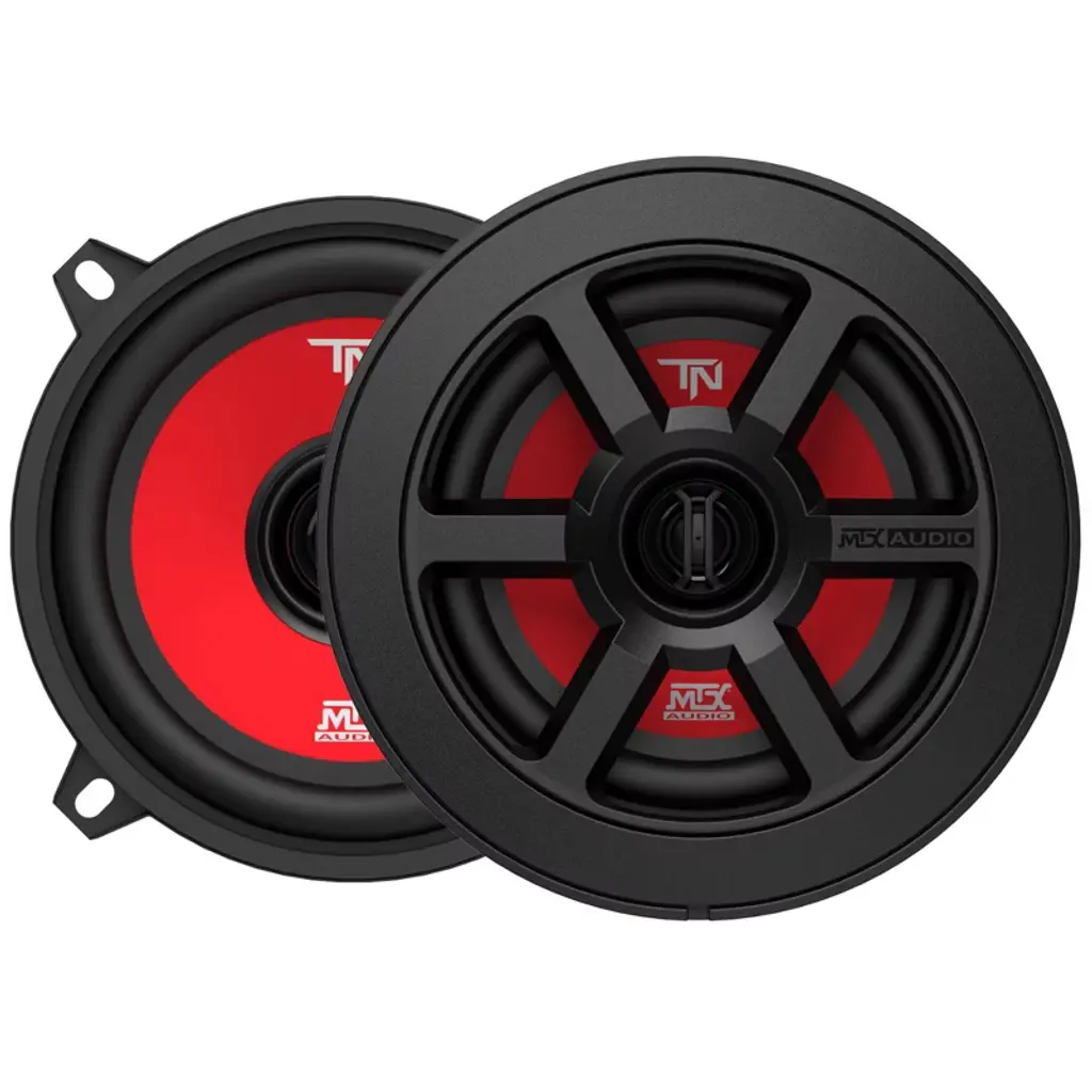 Enhance your car audio experience with the MTX Audio TERMINATOR5 Terminator Series 5.25" 2-Way 35W RMS 4-Ohm Coaxial Speaker Pair bundle. Upgrade your factory sound system effortlessly with these speakers designed to elevate your listening enjoyment. The TERMINATOR5 speakers offer 35W RMS power handling and a durable construction featuring a steel basket, polypropylene cone, and mylar dome tweeter for clear and powerful sound. Benefit from Point Source Technology that enhances sonic accuracy by preventing tweeter and woofer sound wave interference, resulting in distortion-free audio. The sleek red cone design adds a stylish touch to your car interior, while the removable grille with a hidden mounting screw ring ensures a seamless installation. Experience the exceptional sound quality of the TERMINATOR series speakers, whether you are replacing factory speakers, amplifying with a source unit, or connecting to an aftermarket amplifier. These speakers provide a frequency response of 65Hz-20kHz, 4Ω impedance, and a sensitivity of 85.3dB for a dynamic audio performance. SPECIFICATIONS: • Impedance: 4Ω • RMS Power: 35W • Sensitivity: 85.3dB • Frequency Response: 65Hz - 20kHz • Cone Material: Polypropylene • Grille Included: Yes • Crossover: Not applicable • Mounting Depth: 1.69" (4.3 cm) Upgrade your car audio setup with the MTX Audio TERMINATOR5 speakers and enjoy high-quality sound reproduction at an unbeatable price. Elevate your driving experience with powerful, clear audio performance that transforms your commute into a concert on wheels. Bring your music to life with the TERMINATOR series speakers and enjoy music as it's meant to be heard.