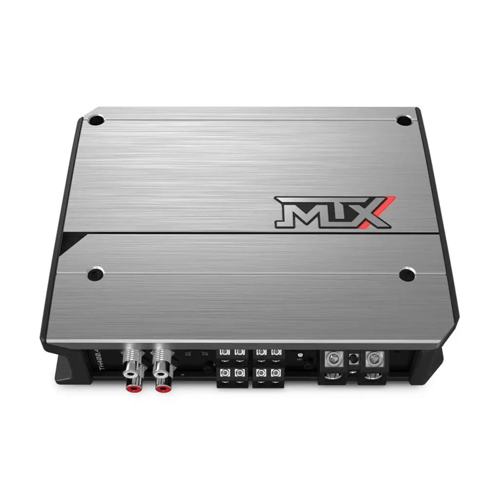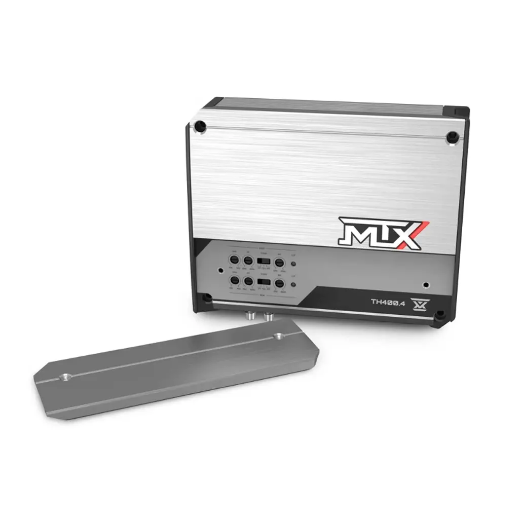 THUNDER 400-Watt RMS Full Range Class-D 4-Channel Amplifier Powerful, Full-Range Sound in Every Drive Elevate your car audio system with the TH400.4, a versatile 4-channel amplifier from MTX Audio’s THUNDER Series. Delivering 400 watts RMS, this compact amplifier provides balanced, high-quality sound across every speaker. With efficient Class-D technology, adjustable controls, and advanced protection features, the TH400.4 ensures immersive, distortion-free audio for any drive. Protection and Peace of Mind Engineered for durability, the TH400.4 features an LED power and protection indicator, alerting you to any thermal, short, or voltage issues. This advanced protection ensures reliable performance, safeguarding your system so you can focus on the music, whether cruising city streets or heading out on a long road trip. Features 400 Watts RMS Power Output Reliable Full-Range Class-D Circuit Design Compact Size for Flexible Installation 10V High-Level Audio Input Compatibility High-Quality Tiffany-Style RCA Input Power and Protection LED Indicator Light Surface Mount Component Technology Direct Insert Power and Speaker Terminals Thermal, Short, and Over/Under Voltage Protection Clip Detection Light for Tuning Optimization Dyno Power Rating Certificate Included Specifications Description: 4-Channel Topology: Full Range Class D 4Ω RMS Power Output: 50W x 4 Channels 2Ω RMS Power Output: 100W x 4 Channels 4Ω RMS Bridged Power Output: 200W x 2 Channels THD: < 0.1% Signal to Noise Ratio: > 98dB Frequency Response: 20Hz - 20KHz Crossover: 40Hz - 400Hz Maximum Input Signal: 10V Warranty Period: 24 months from date of purchase Dimensions & Weight Length: 6 ³⁄₄” (171mm) Width: 7” (178mm) Depth: 2” (51mm) Weight: 4.88 lbs (2.21 kg)