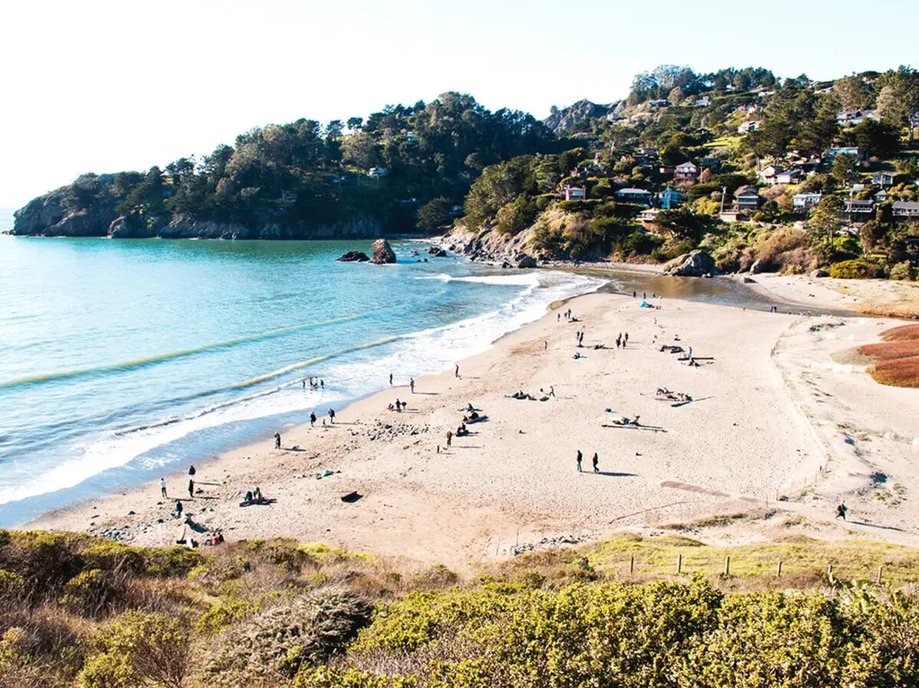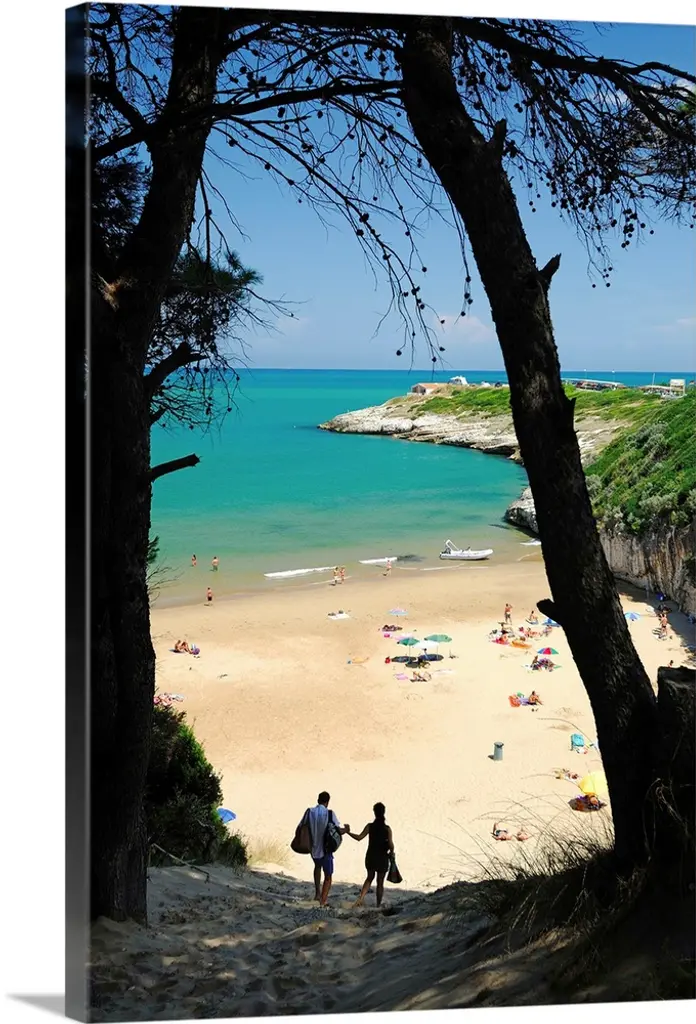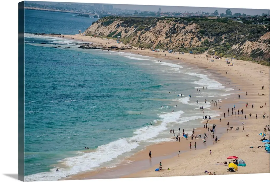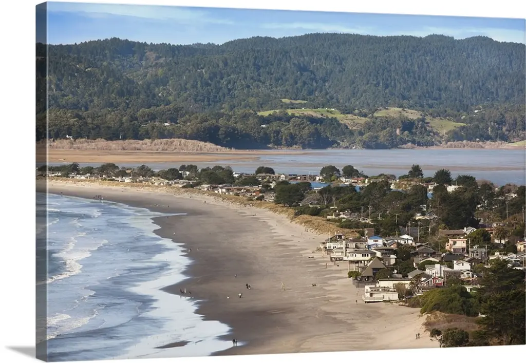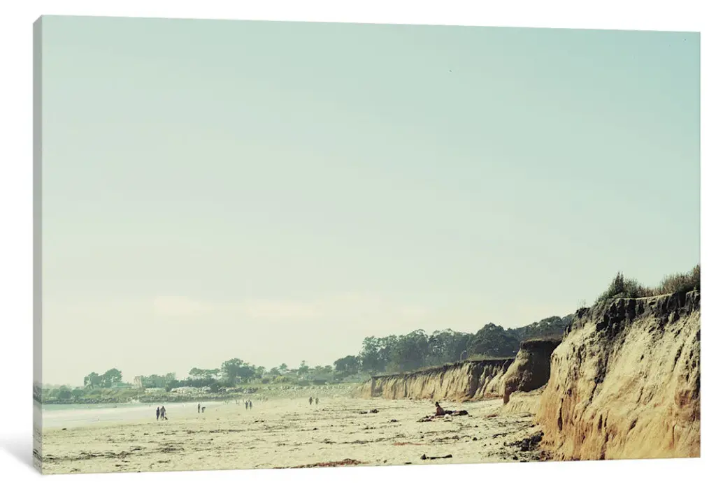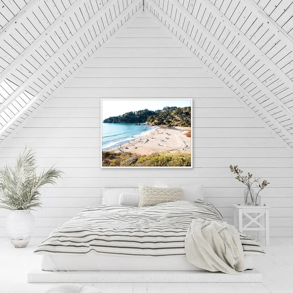 Muir 2 is a sun-drenched beachfront with relaxed figures wandering along the tide and colorful houses comfortably spotted against a rolling mountainous landscape.