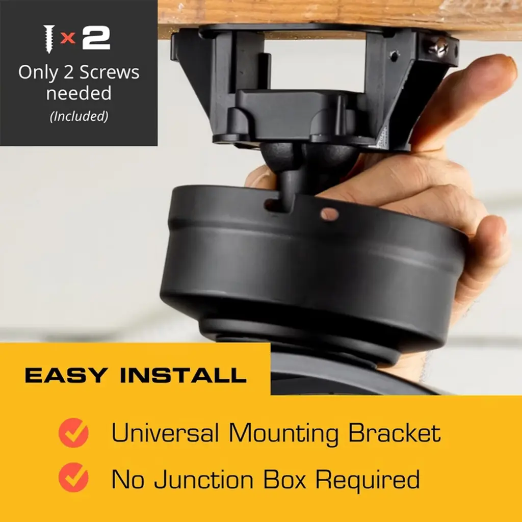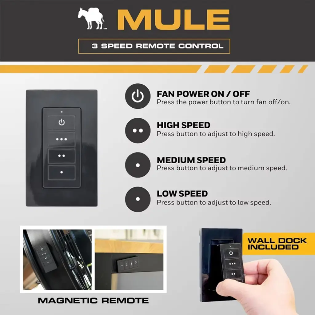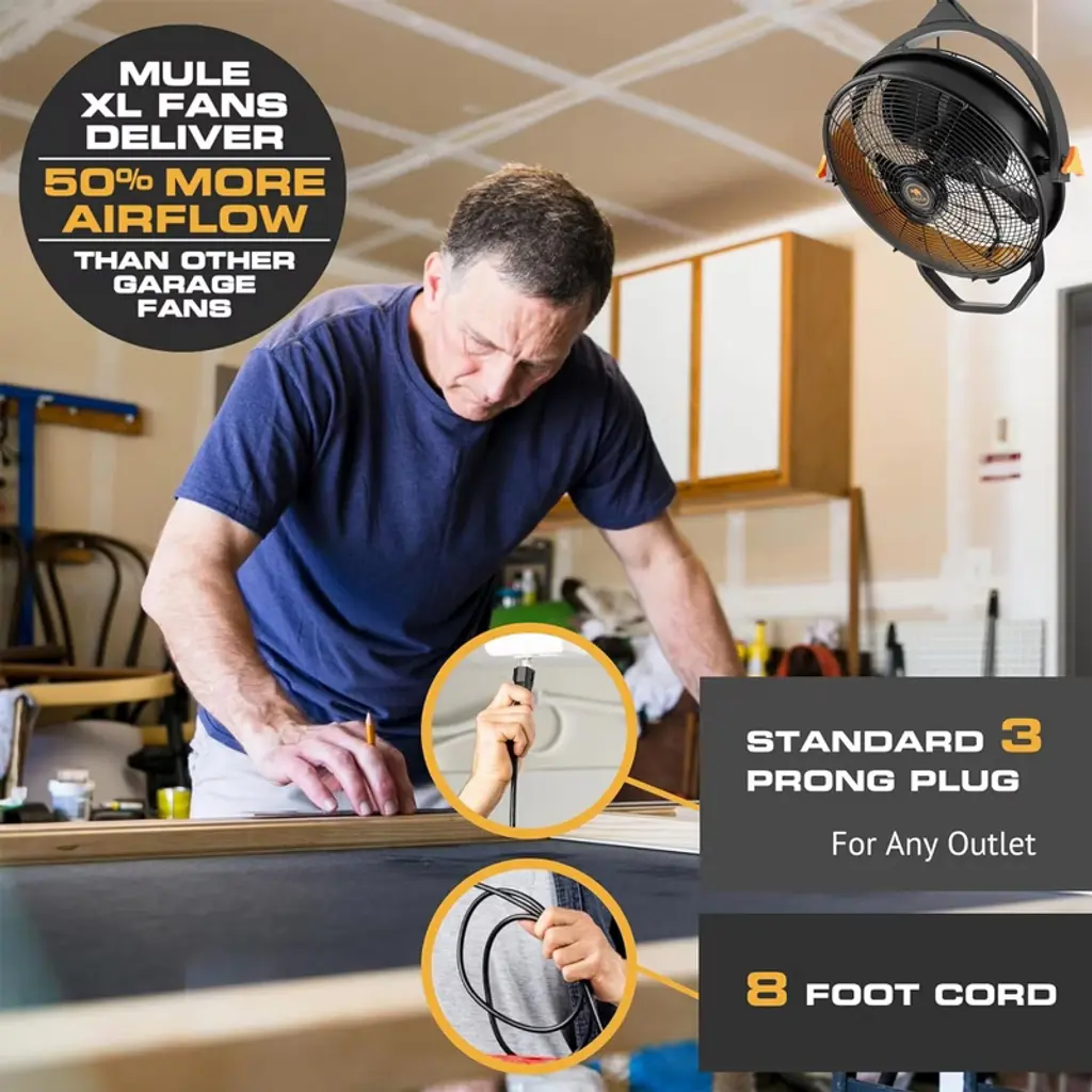 Looking to upgrade your garage, workshop, or outdoor covered space with powerful, efficient airflow? The 18-inch MULE Garage Celing Mount Fan XL with Remote is your go-to solution for year-round comfort. Designed for covered outdoor spaces like garages and shops, this fan delivers exceptional airflow and adjustability. Its matte finish blends beautifully with your environment, while the plug-in design means no complicated wiring—just mount, plug in, and cool down. With industry-leading 5400 CFM and 3-speed settings, this fan offers customizable airflow to meet your needs. Plus, the included remote give you ultimate operational convenience. The fan also includes a 360-degree swivel and vertical tilt, so you can direct airflow exactly where it's needed. Easily install this high velocity fan using the universal mounting bracket for secure hanging with just 2 woods screws into a joist. No installation of a junction box needed, and 2 downrods (6-inch and 12-inch) are included for adjustable ceiling mounting. The 96-inch cord provides flexible placement and includes 6 adhesive clips to keep things neat. Built for durability in damp-rated conditions, it’s ideal for covered patios or indoor environments where airflow is a must. The standard 3-prong plug adds convenience and eliminates the need for hardwiring. Built by Mule to withstand tough conditions, this shop fan comes backed by a 3-year limited warranty. Whether you're outfitting a backyard hangout or boosting airflow indoors, the Mule Outdoor Garage Ceiling Mount Fan XL with Remote is a powerful, adjustable, and reliable solution to outdoor cooling needs.