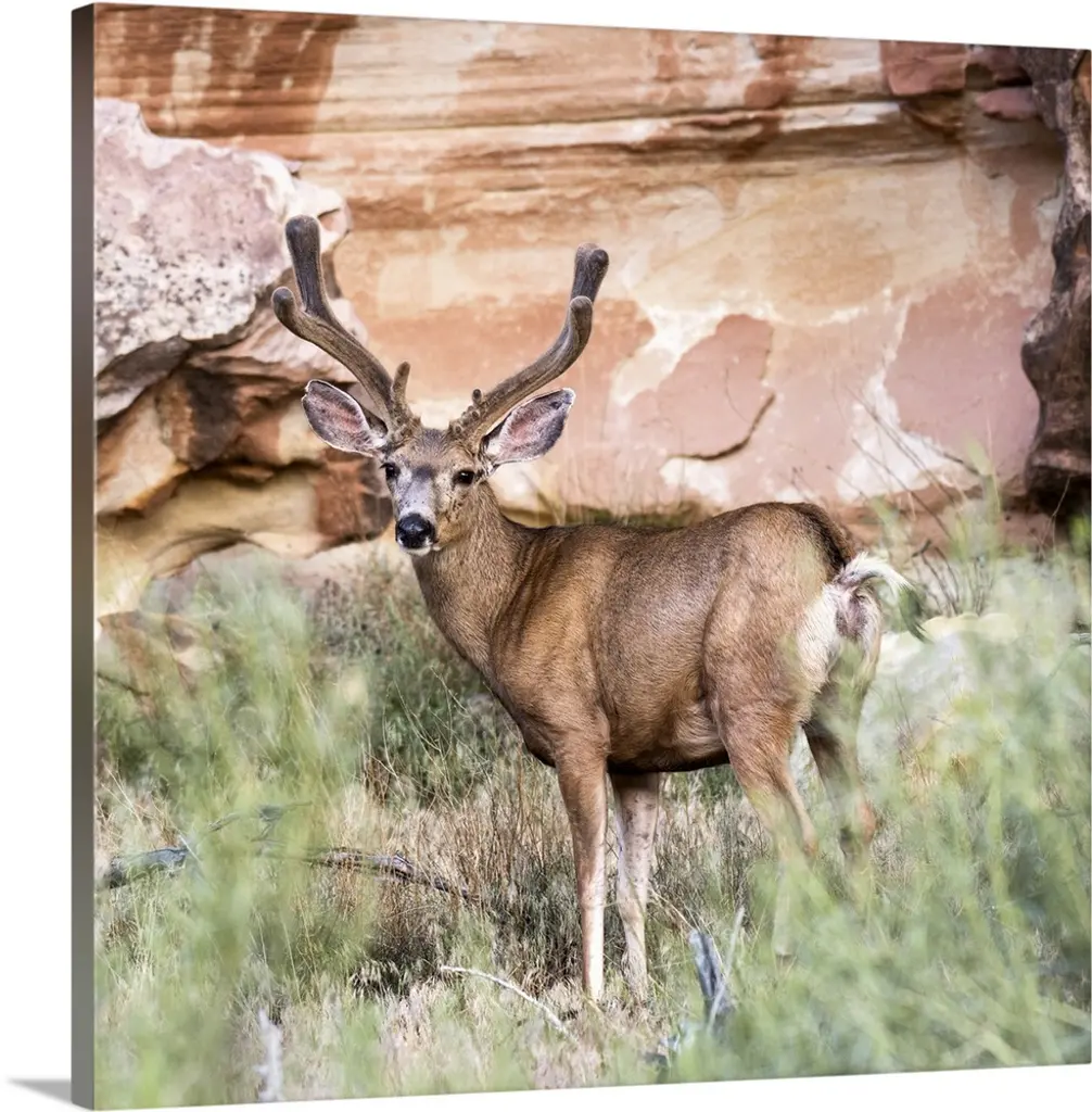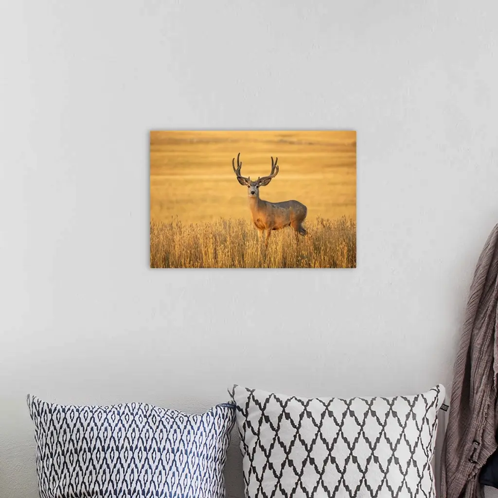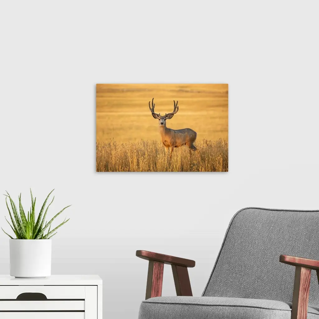Mule deer buck (Odocoileus hemionus) standing in golden grass; Steamboat Springs, Colorado, United States of America