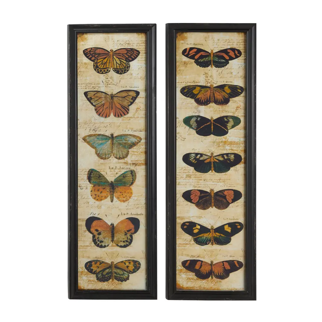 This wall art exude natural beauty and sophistication in both color and composition. Showcase your personality and turn your walls into an art gallery with this impressive wall art. Hang this set of butterfly art wall Decors as a focal point above a piece of furniture in your entryway, living room, bedroom, or dining area. This item ships in 1 carton. Can be hung vertically using the sawtooths; nails and screws not included. Suitable for indoor use only. This item ships fully assembled in one piece. This multi colored glass canvas wall art comes as a set of 2. Vintage style. This stunning set of multicolor butterfly wall decors showcases various vintage calligraphic writings.