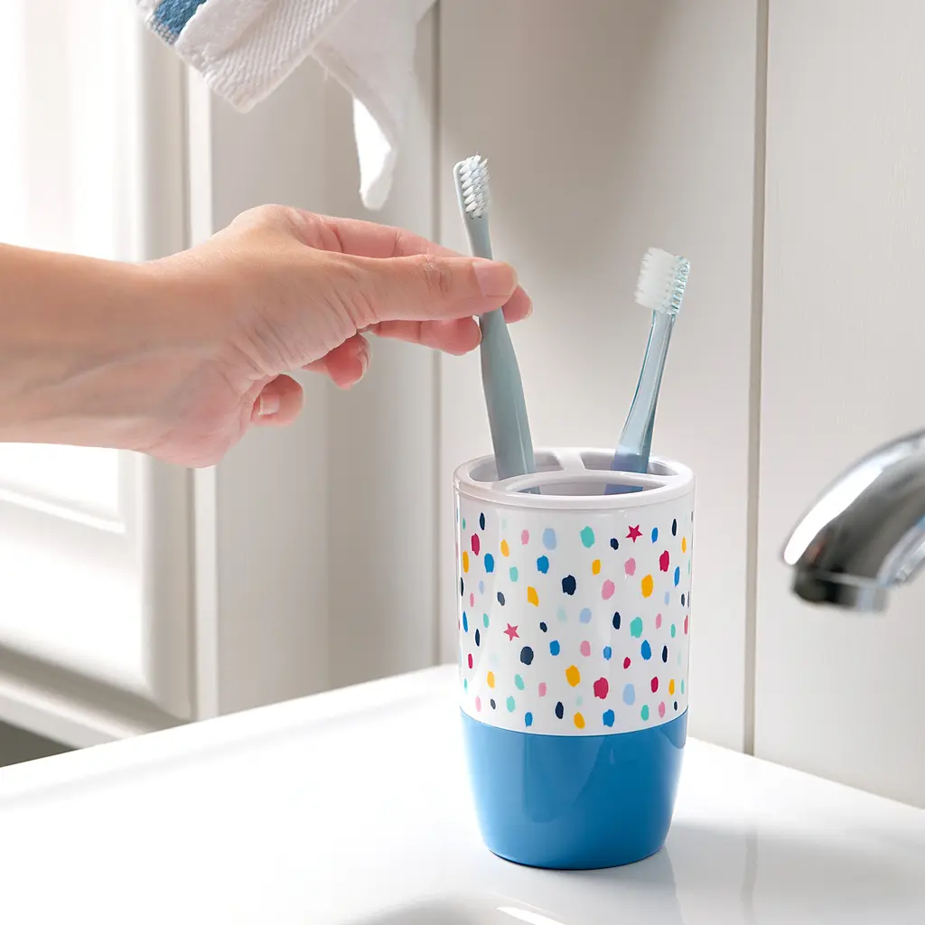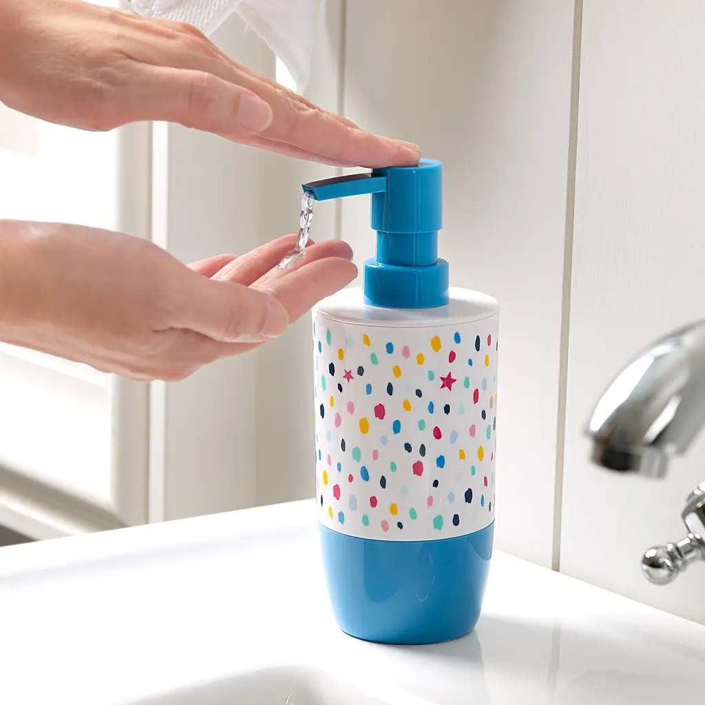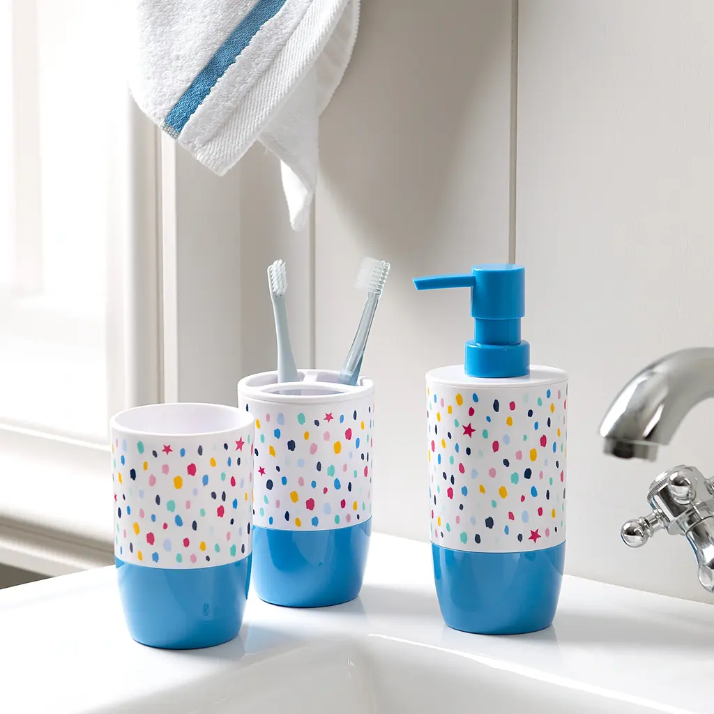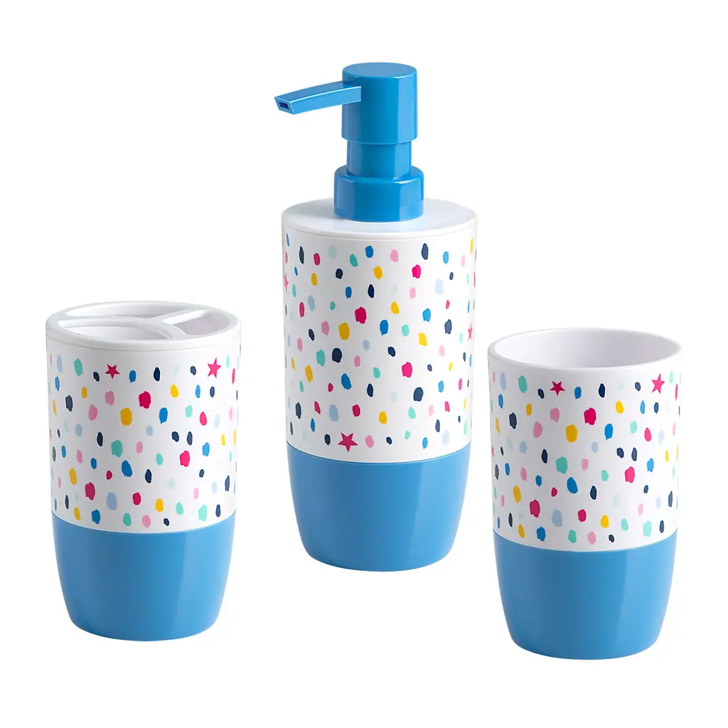 Infuse a fun pop of color and a playful vibe into your bathroom with the Multi Confetti Dot 3-Piece Accessory Set by Allure Home Creation. The set includes a Soap/Lotion Pump with a Plastic Pump Head in Blue, Toothbrush Holder, and Tumbler. Each cylindrical shaped piece of this artsy splash confetti print with tossed stars collection is made of durable plastic with decals in a bright multi-colored pallet with a solid blue base on a white background. This eye-catching design is perfect for kids and tweens and will surely dress up and enliven their bath space. Hand Wash, Spot or Wipe Clean. Complete the look by coordinating with other pieces in the Multi Confetti Dot Bath Collection or use alone.