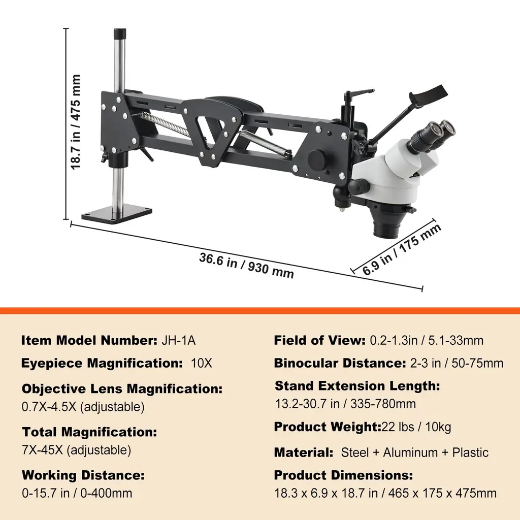 7X-45X Continuous Zoom: This jewelry microscope with spring bracket provides high-definition clarity and a wide field of view for your work. With a working height of 3.7-11.8in (95-300mm) / 0-15.7 inches (0-400mm), a field of view range of 0.2-1.3 inches / 5.1-33mm, and a lens ring of 3 inches / 77mm, it provides high clarity and strong stereoscopic effect. Reinforced Multi-Angle Adjustable Stand: The reinforced stand of the jewelers microscope can be adjusted up, down, left, right, forward, and backward. The stable structure helps reduce vibrations for precise observations. For 3.7-11.8in option: The maximum working distance is 35.4 in / 900mm, and the minimum working distance is 7.9in / 200mm. For 0-15.7 inches option: The maximum working distance is 30.7 inches / 780mm, and the minimum working distance is 13.2 inches / 335mm. Quick Release Stand Structure: The multi-directional microscope is designed with a quick release stand structure, allowing for quick loosening of the stand joints. Simply follow 3 steps—press the button, lift the handle, and twist to tighten, making observation work simpler. Integrated Ring LED Light: The integrated design ensures more even lighting and easier installation. With 144 LED lights providing ample illumination at 18000-35000 lumens, it clearly presents the details of the jewelry. The microscope jewelry inlaid stand uses a USB interface for more convenient installation. Support for Simultaneous Observation and Adjustment: The simple adjustment mechanism of the stereo microscope allows for quick and precise adjustments of diopter, magnification, and lens distance, making your work more efficient. 360° Universal Ball Vise (only for 3.7-11.8in option): The stereo microscope comes with a ball vise, featuring a hardened chrome plating process that is scratch-resistant, rust-resistant, and anti-glare, reducing eye fatigue. It rotates smoothly, enhancing your work efficiency. 3.7-11.8in Package Content 1 x Main Body Stand 1 x Microscope Assembly 1 x Microscope Support Stand (Basketball Hoop Shape) 1 x Ring Light 1 x Dust Cover 1 x Head Support Rod 2 x Eyepieces 1 x Objective Lens 2 x Eye Shields 1 x Universal Ball Vise x 1 1 x Plastic Base x 1 1 x Micro-Inlay Positioning Tool Set 1 x Installation Kit 1 x User Manual 0-15.7 inches Package Content 1 x Main Body Stand 1 x Microscope Assembly 1 x Microscope Support Stand (Basketball Hoop Shape) 1 x Ring Light 1 x Dust Cover 1 x Head Support Rod 2 x Eyepieces 1 x Objective Lens 2 x Eye Shields 1 x Installation Kit 1 x User Manual