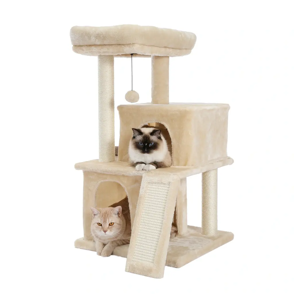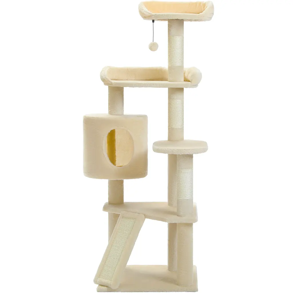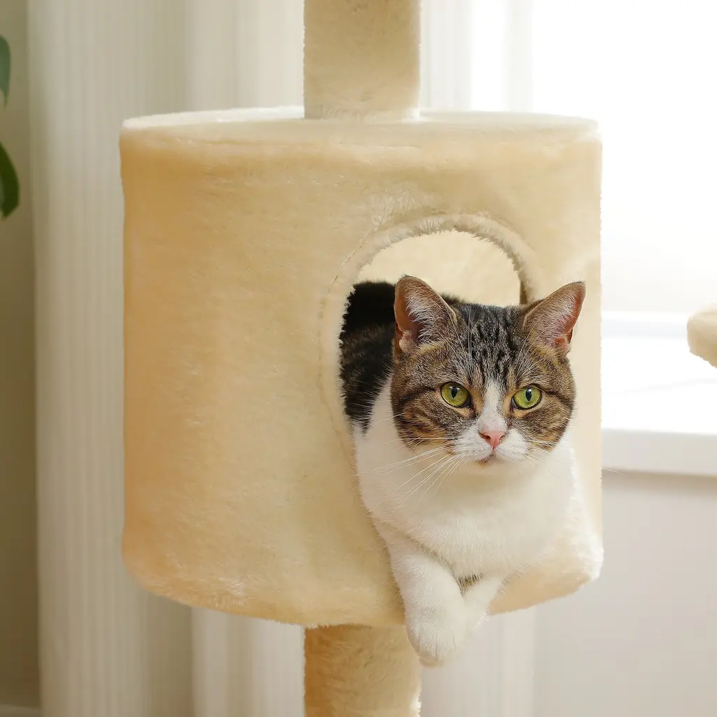 Multi-Level Cat Climbing Tower With Cat Condo, Cat Tree With Scratching Board - Beige