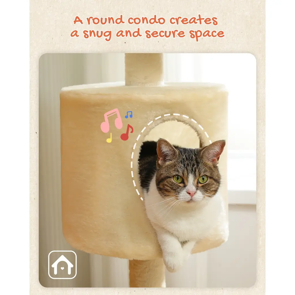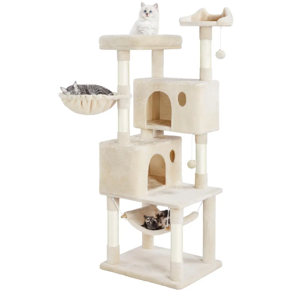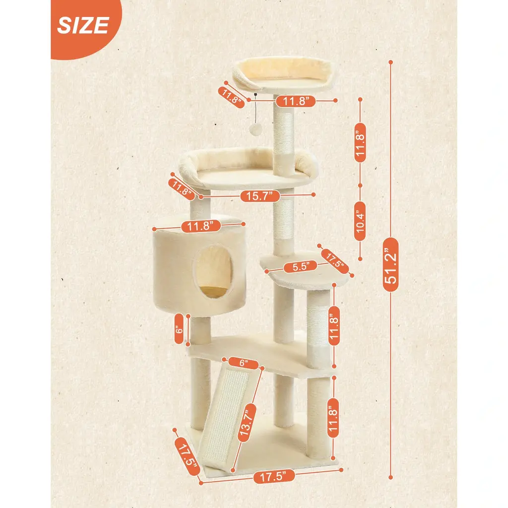 Multi-Level Cat Climbing Tower With Cat Condo, Cat Tree With Scratching Board - Beige