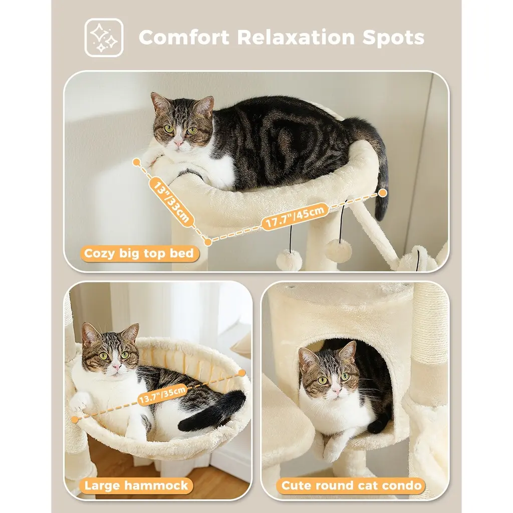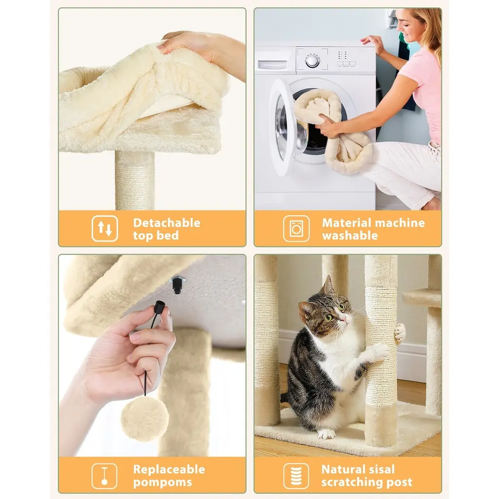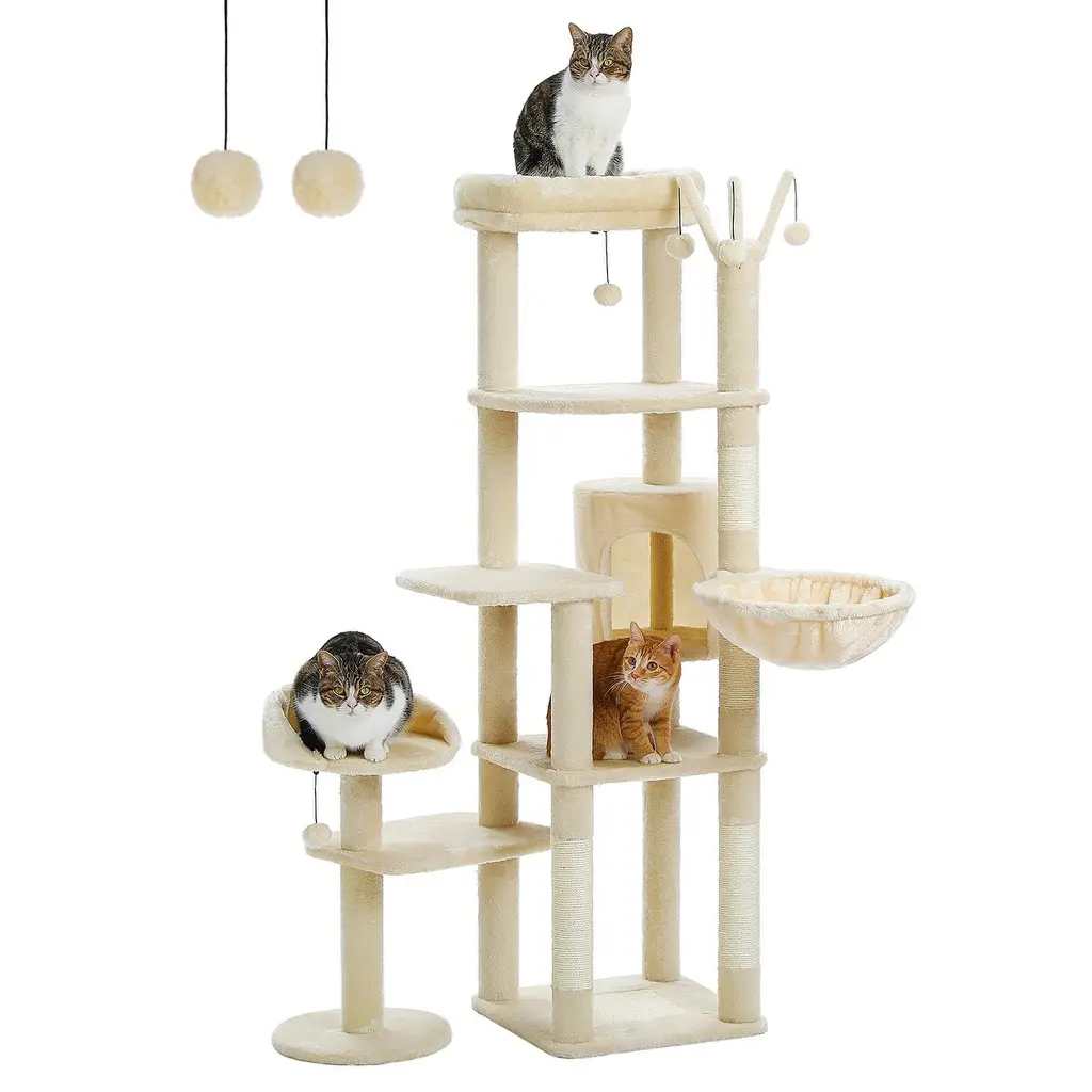 Multi-Level Cat Tree With 3 Removable Pompom Sticks, Condo, Hammock, Scratching Post & 2 Perches - Beige