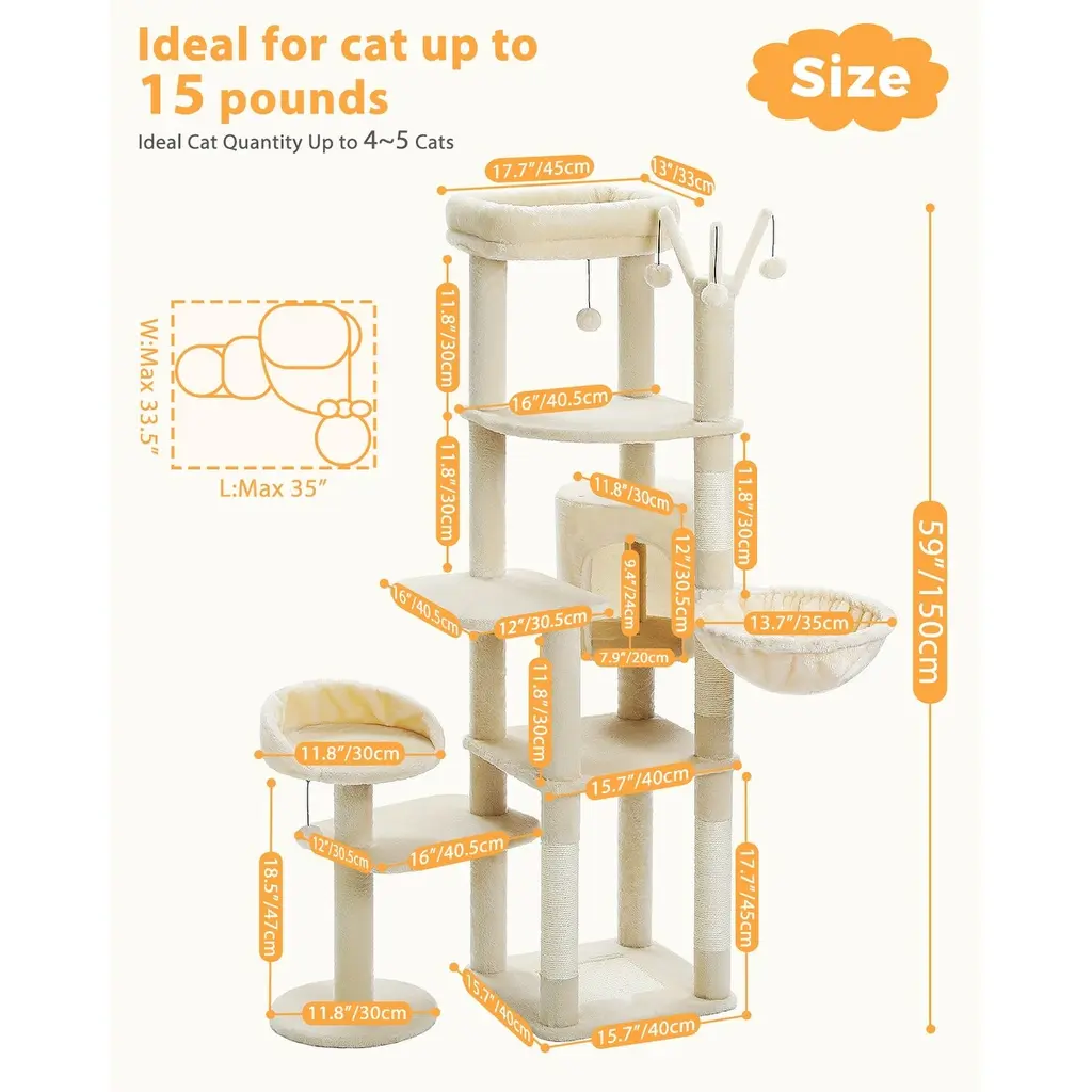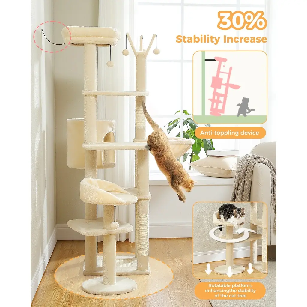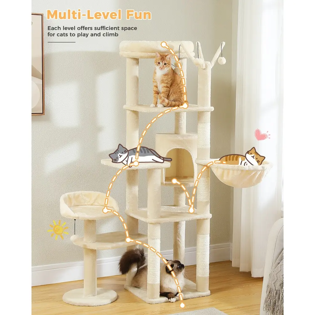 Multi-Level Cat Tree With 3 Removable Pompom Sticks, Condo, Hammock, Scratching Post & 2 Perches - Beige