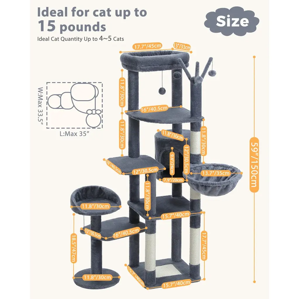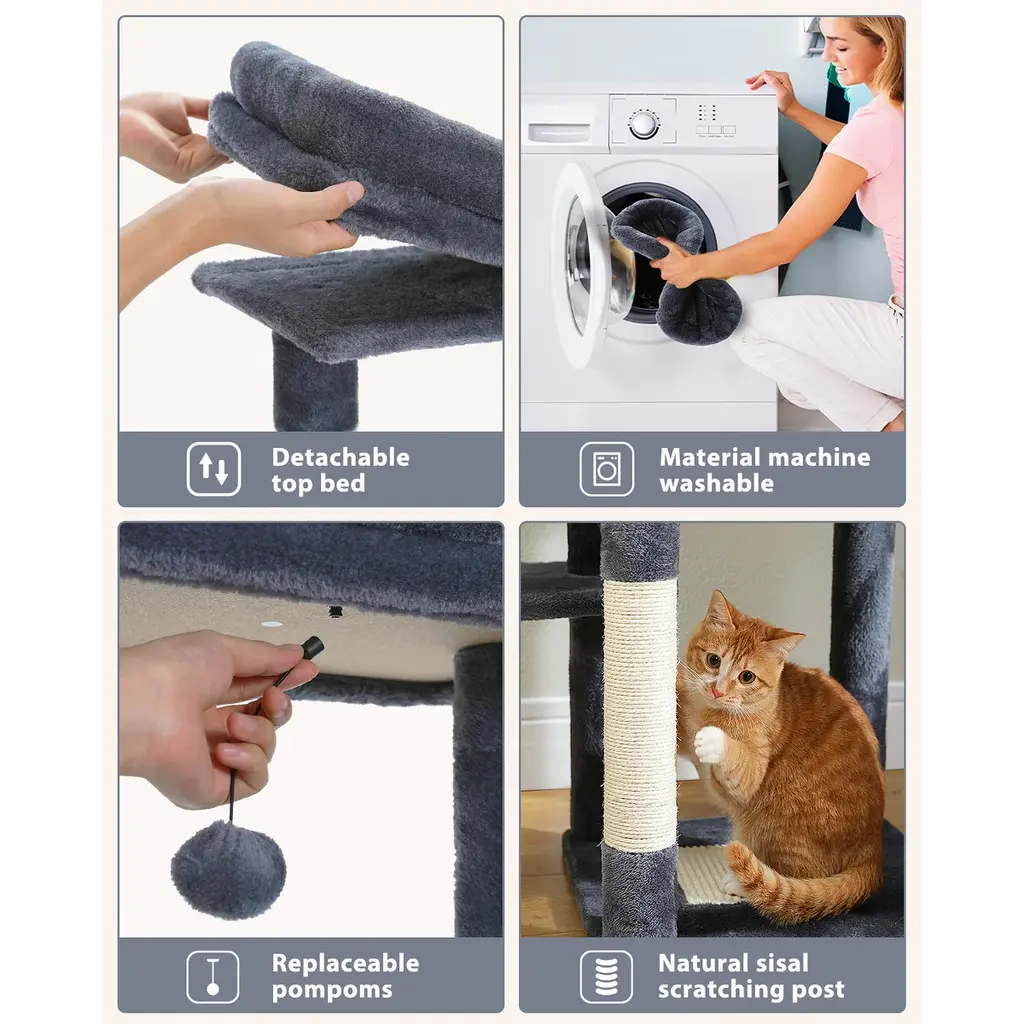 Multi-Level Cat Tree With 3 Removable Pompom Sticks, Condo, Hammock, Scratching Post & 2 Perches - Dark Grey