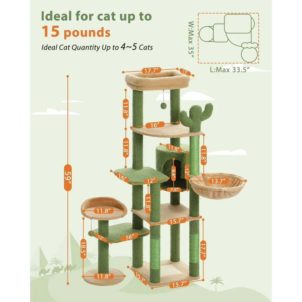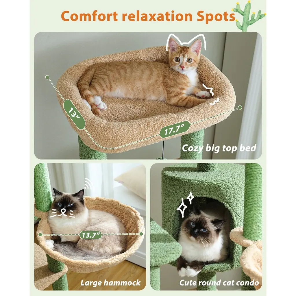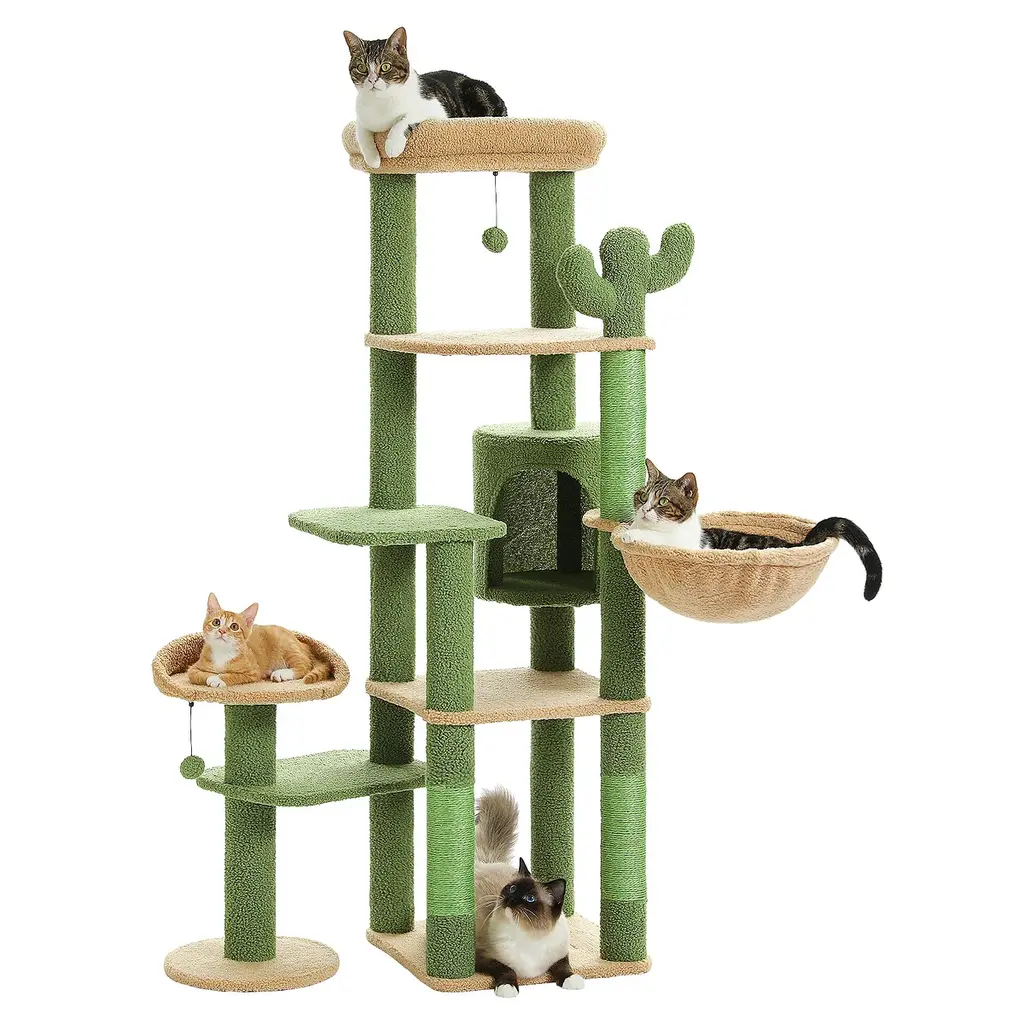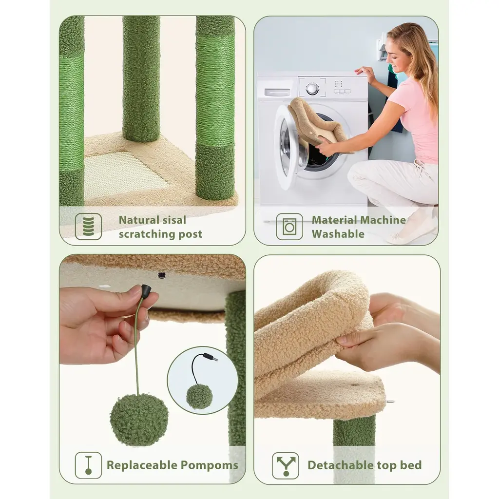 Multi-Level Cat Tree With 3 Removable Pompom Sticks, Condo, Hammock, Scratching Post & 2 Perches - Green