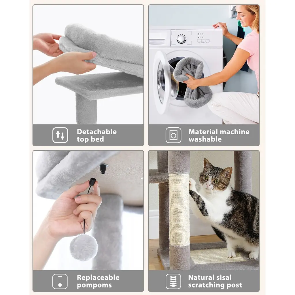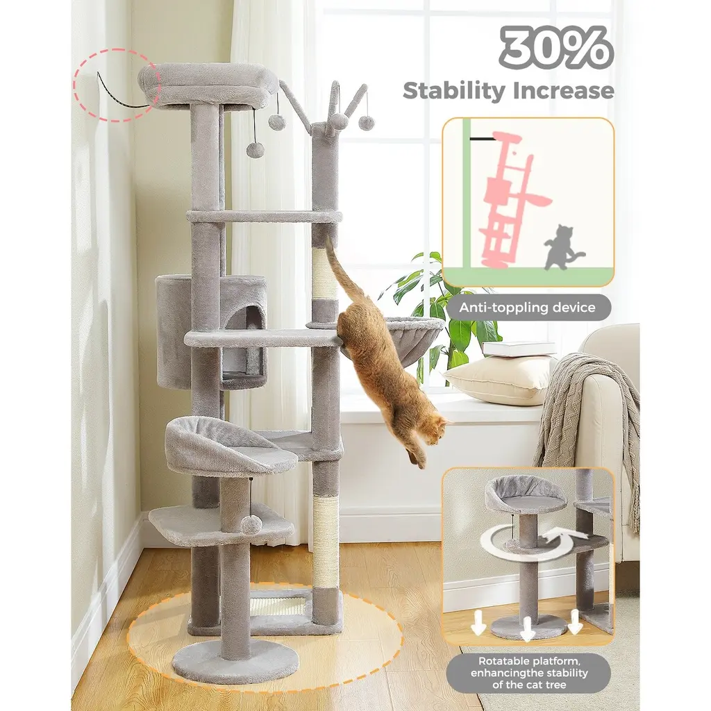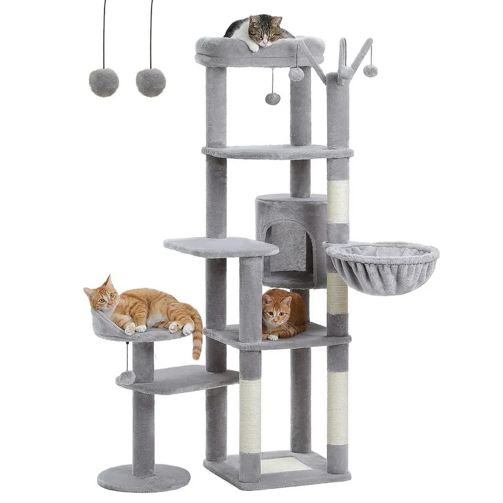 Multi-Level Cat Tree With 3 Removable Pompom Sticks, Condo, Hammock, Scratching Post & 2 Perches - Grey