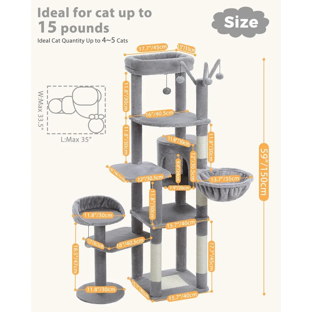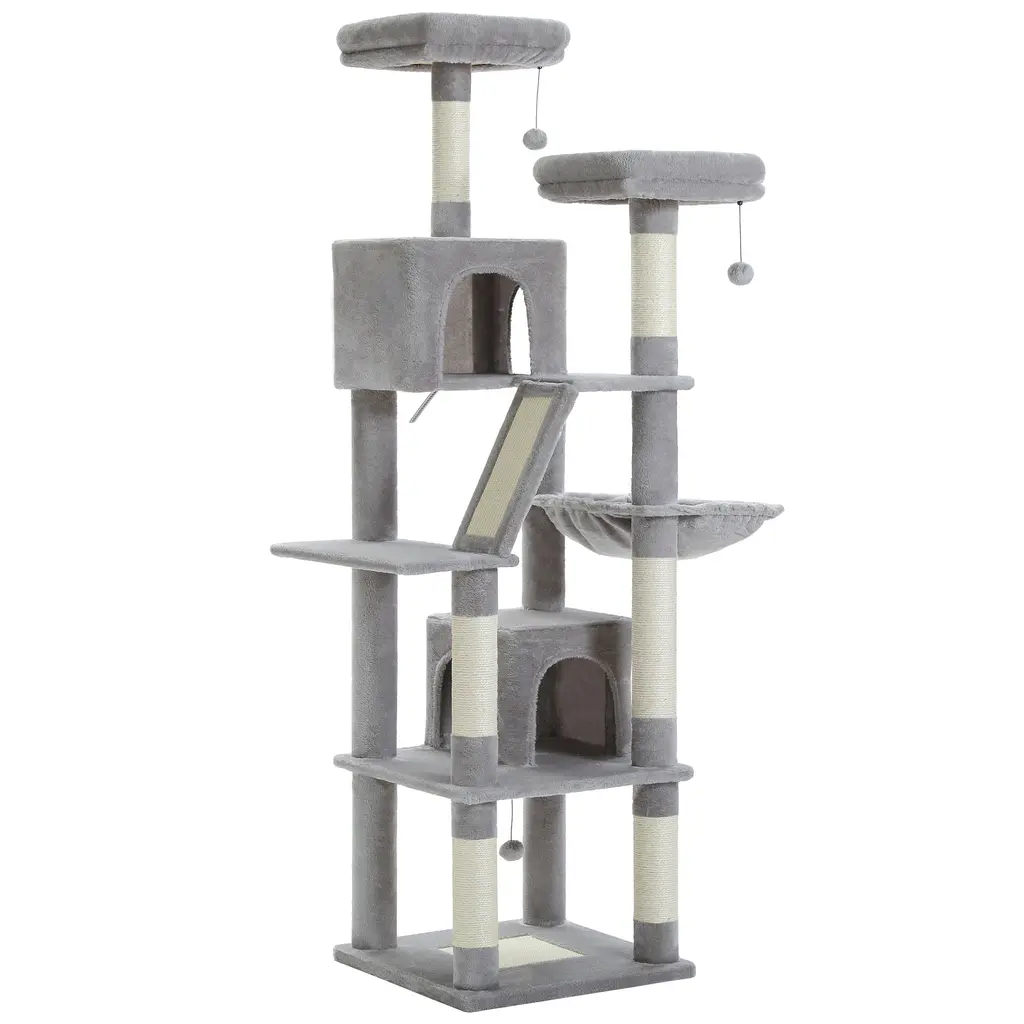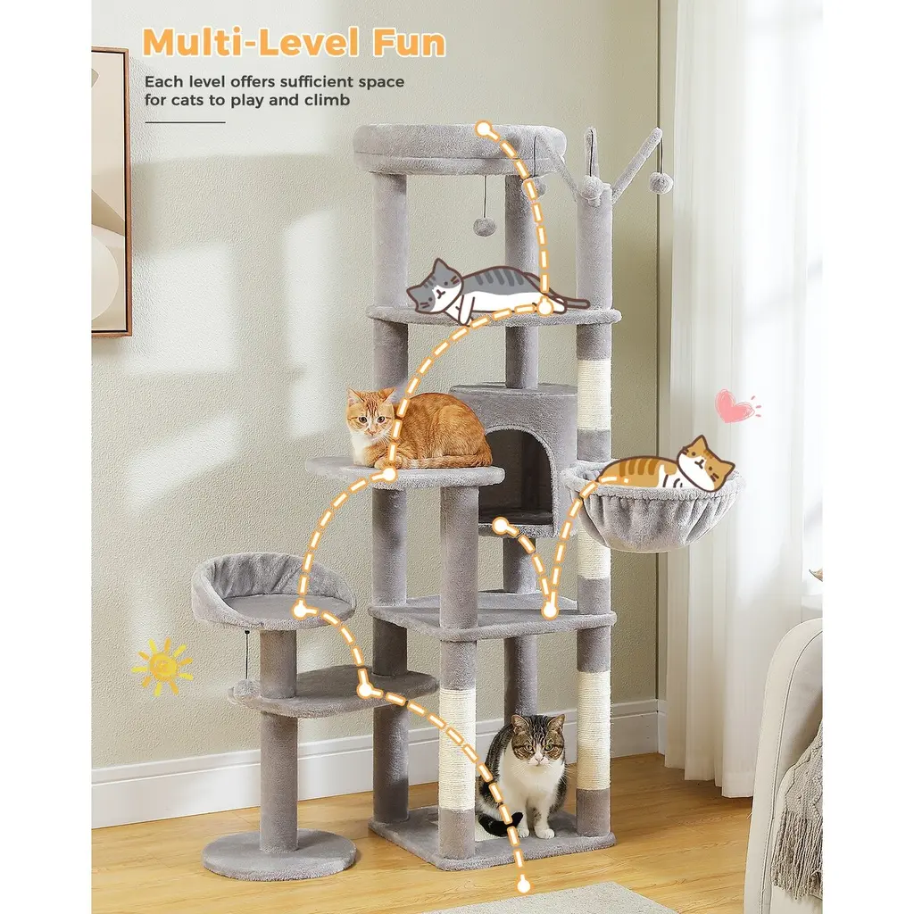 Multi-Level Cat Tree With 3 Removable Pompom Sticks, Condo, Hammock, Scratching Post & 2 Perches - Grey