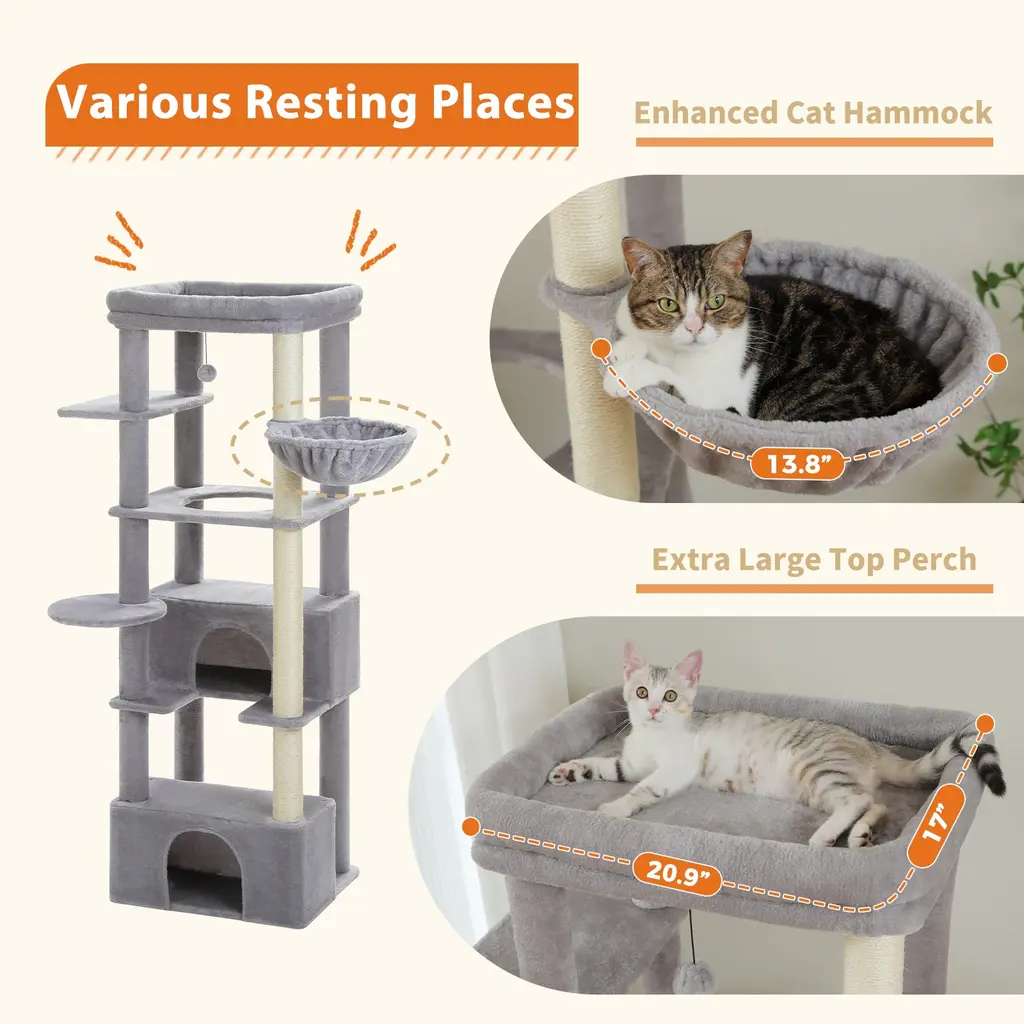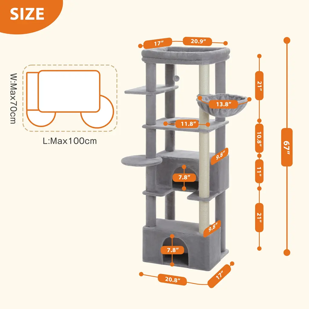 Standing at an impressive 68 inches tall, this cat tower is a true marvel of engineering. Crafted with sturdy boards, durable cardboard tubes, plush fabric, and sisal rope, it combines durability with style. The sleek and modern design effortlessly blends into any home decor, making it a statement piece in your living space. Spacious Condos: Our cat tower comes with two generously-sized cat condos, providing the perfect hideaway for your feline companions. Each condo offers a cozy and secure space for your cats to relax, nap, and recharge after a long day of play. The plush interiors ensure maximum comfort and warmth, making it their favorite spot in the house. Oversized Top Perch: Your cats will feel like kings and queens as they ascend to the top of the tower. The extra-large top perch, measuring 21 inches by 17 inches, offers a panoramic view of their surroundings. Whether it's bird-watching or simply basking in the sunlight, this elevated sanctuary provides the ultimate vantage point for your curious feline explorers. Interactive Scratching Posts: We understand the importance of satisfying your cat's natural instinct to scratch. That's why our cat tower includes multiple scratching posts wrapped in high-quality sisal rope. These posts not only provide a dedicated scratching surface but also promote healthy nail growth and help protect your furniture from unwanted claw marks. Comfortable Hammock: Treat your cats to the ultimate relaxation experience with the included comfortable hammock. Measuring 14 inches in diameter, this enhanced cat hammock offers a soft and secure place for your pets to lounge, nap, or simply enjoy a moment of tranquility. Watch as they curl up in blissful contentment, swaying gently in their personal haven. At our company, we take pride in delivering products of the highest quality. While the product color may vary slightly from the images, rest assured that the materials used are durable and safe for your cats. If you have any questions or concerns, our dedicated customer service team is always ready to assist you.