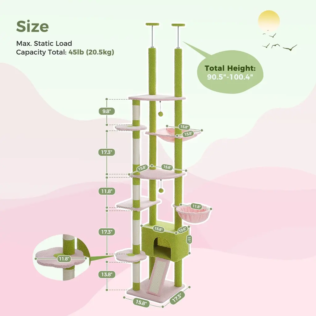 Welcome to the world of feline bliss! The Ultimate Cat Tree is a versatile and innovative solution for every cat owner. With its adjustable height feature, ranging from 90.5 inches to 100.4 inches, you can customize the tree to suit your cat's preferences. Whether you have a playful kitten or a senior cat, this cat tree is designed to accommodate them all. Say goodbye to the hassle of constantly buying new cat trees as your furry friend grows - the Ultimate Cat Tree grows with them! Cat Apartment and Cozy Hammock: Cats love having their own little space to retreat to, and the Ultimate Cat Tree provides just that. The built-in cat apartment offers a cozy and private sanctuary for your feline companions. With plush interiors and a secure entrance, it's the perfect spot for your cat to relax, nap, or simply observe the world from a safe distance. And let's not forget about the cozy hammock - a favorite spot for lazy afternoons and leisurely lounging. Scratching Posts and Natural Instincts: We understand that cats have a natural instinct to scratch, and that's why the Ultimate Cat Tree is equipped with multiple scratching posts. Made from durable materials, these posts provide an ideal outlet for your cat's scratching needs, saving your furniture from their sharp claws. Let your cat indulge in its primal instincts without worry - our scratching posts are built to withstand even the most enthusiastic scratchers. Comfort and Quality: We believe that every cat deserves the best, which is why we've meticulously designed the Ultimate Cat Tree with comfort and quality in mind. The plush fabric covering on each level ensures a soft and cozy experience for your cat. The high-quality particle board used in its construction guarantees sturdiness and stability, giving you peace of mind knowing that your cat is safe while they explore and play. Aesthetic Appeal: Not only does the Ultimate Cat Tree offer functionality and comfort, but it also adds a touch of style to your home. With its sleek design and modern aesthetic, it seamlessly blends into any living space. The neutral color palette complements a variety of interior decor styles, making it a tasteful addition to your home. Your cat will love their new playground, and you'll love the way it enhances the overall look of your space. Don't miss out on the opportunity to treat your beloved feline companion to the Ultimate Cat Tree. With its adjustable height, cat apartment, cozy hammock, and scratching posts, it has everything your cat needs for endless hours of fun and relaxation. Please note that the product color may slightly vary from the images. If you have any questions or concerns, our friendly customer service team is here to assist you. Upgrade your cat's playtime experience and order your Ultimate Cat Tree today!