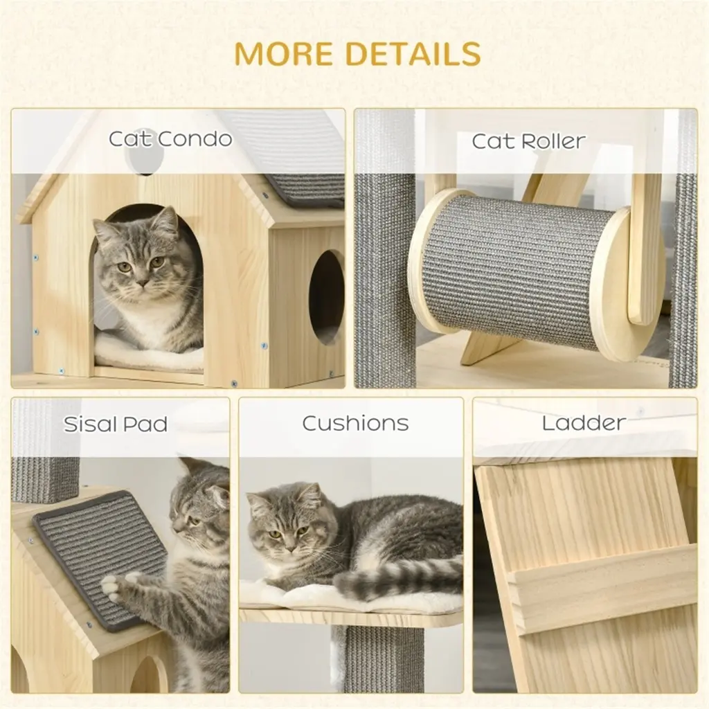 Multi-Level Cat Tree With Scratching Posts, Cushioned Hideout & Spinning Roller Toy For Small Cats - Natural-Grey