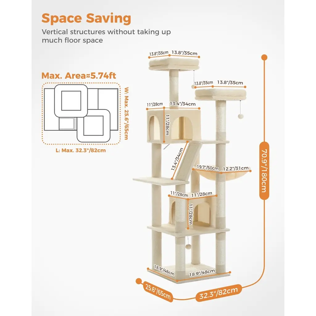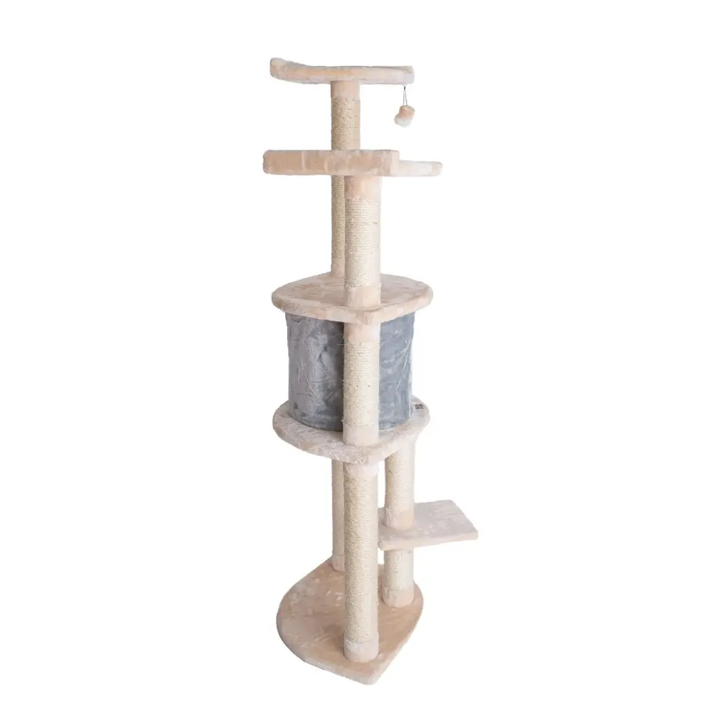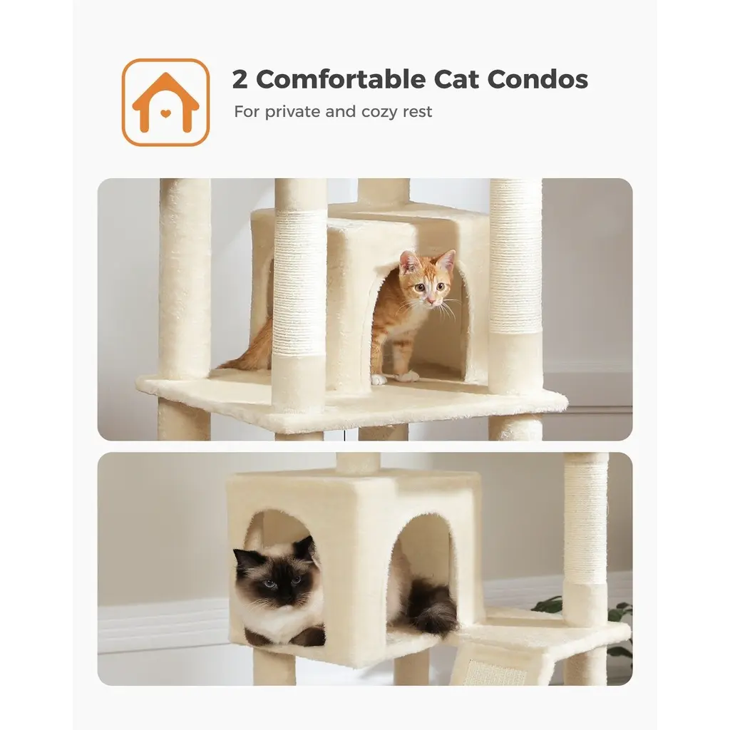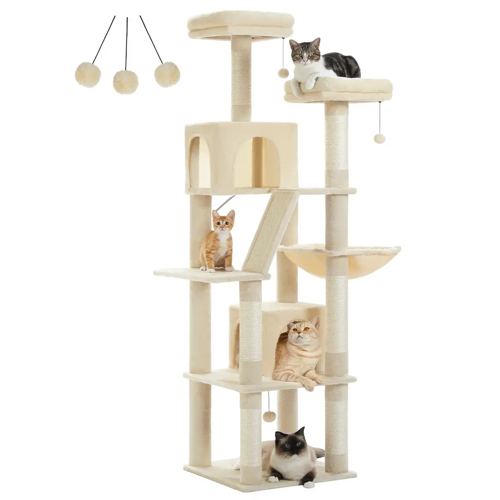 Multi-Level Indoor Large Cat Tree Scratching Post With 2 Perches, 2 Condos, Hammock And 2 Pompoms - Beige