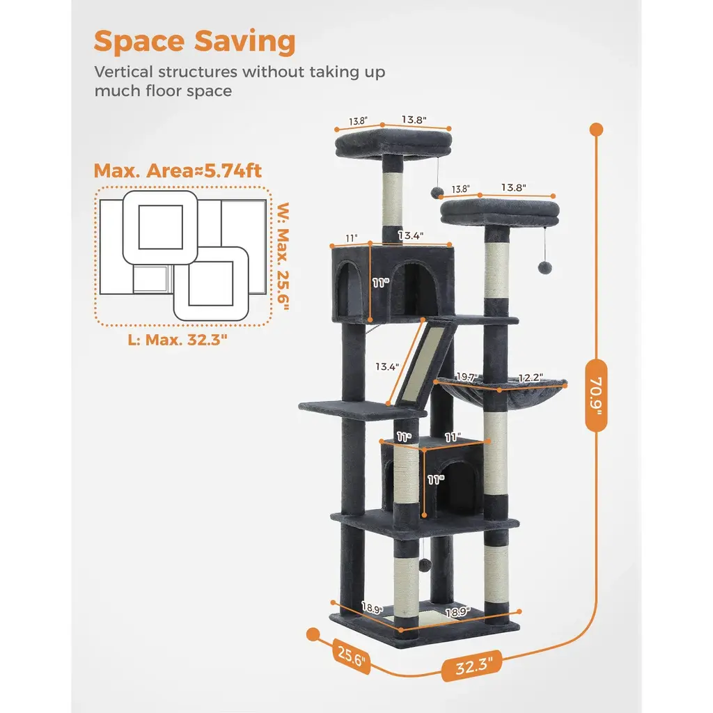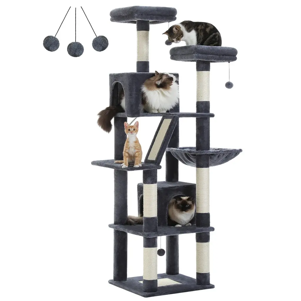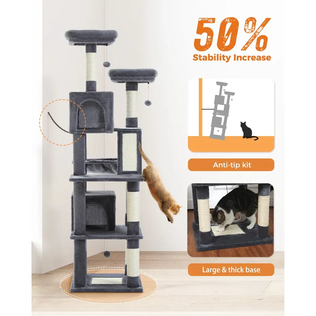 Multi-Level Indoor Large Cat Tree Scratching Post With 2 Perches, 2 Condos, Hammock And 2 Pompoms - Dark Grey