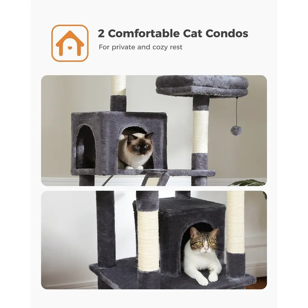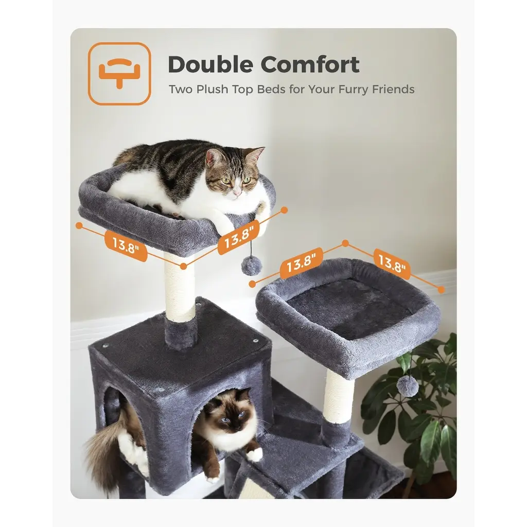 [Perfect for Multi-cat Households]: This large cat tree has more resting spots and can accommodate up to 4-5 small and medium-sized cats at the same time. Two extra-large top perches and a large fluffy cat hammock provide ample space for your fat kitties to stretch and snooze. They can also enjoy batting around the dangly toys or gazing at birds outside the window. Additionally, a spacious fluffy cat condo offers a cozy hideaway for cat naps, covered in plush fabric for ultimate comfort.[Safe Enjoyment of Fun]: This large cat tower with an anti-toppling kit for ensuring Safety and Stability. Additionally, the robust structure and large, thick base provide extra stability for your little cat's secure climbing. Solid particle board guarantees exceptional durability, while the high-quality plush material offers a gentle and comfortable experience. Moreover, the scratching boards and scratching posts are covered with 100% natural sisal, fulfilling all scratching needs.[Easy to Clean]: The removable cover on top of the cat perch makes cleaning a breeze (pro tip: it's machine washable!). Covered in plush fabric, this cat stand can be easily cleaned with a vacuum cleaner, ensuring a clean and inviting resting place for your beloved cats.