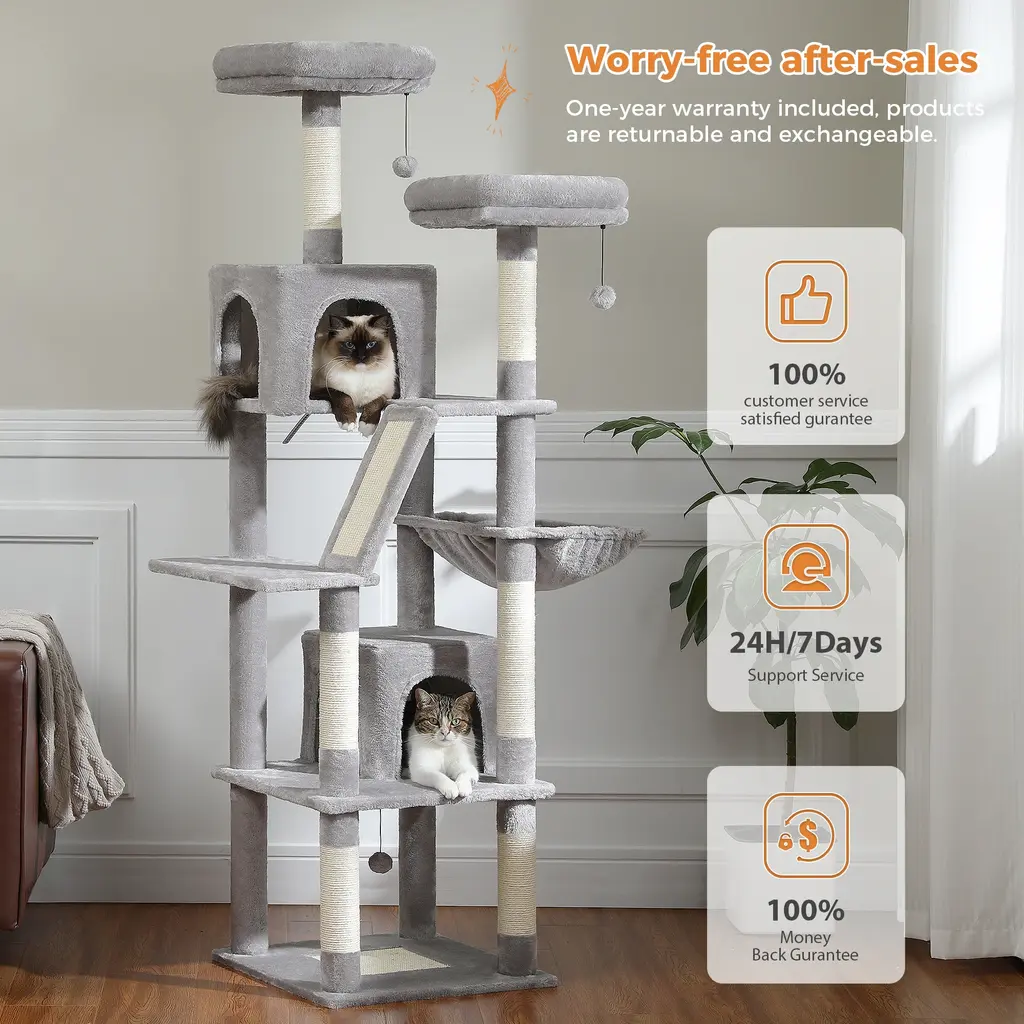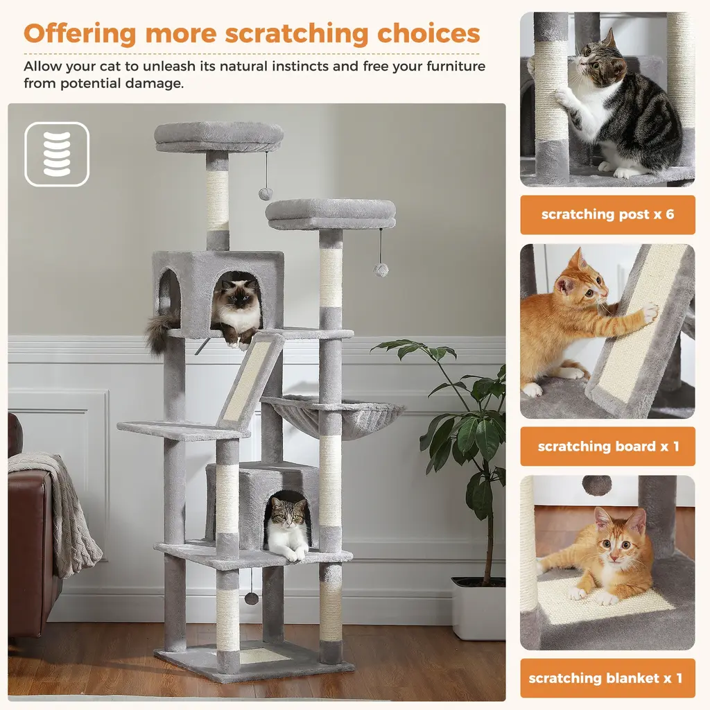 [Perfect for Multi-cat Households]: This large cat tree has more resting spots and can accommodate up to 4-5 small and medium-sized cats at the same time. Two extra-large top perches and a large fluffy cat hammock provide ample space for your fat kitties to stretch and snooze. They can also enjoy batting around the dangly toys or gazing at birds outside the window. Additionally, a spacious fluffy cat condo offers a cozy hideaway for cat naps, covered in plush fabric for ultimate comfort.[Safe Enjoyment of Fun]: This large cat tower with an anti-toppling kit for ensuring Safety and Stability. Additionally, the robust structure and large, thick base provide extra stability for your little cat's secure climbing. Solid particle board guarantees exceptional durability, while the high-quality plush material offers a gentle and comfortable experience. Moreover, the scratching boards and scratching posts are covered with 100% natural sisal, fulfilling all scratching needs.[Easy to Clean]: The removable cover on top of the cat perch makes cleaning a breeze (pro tip: it's machine washable!). Covered in plush fabric, this cat stand can be easily cleaned with a vacuum cleaner, ensuring a clean and inviting resting place for your beloved cats.