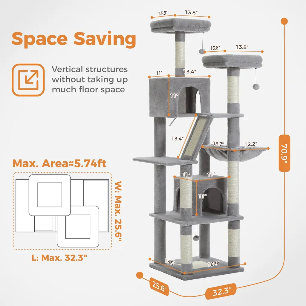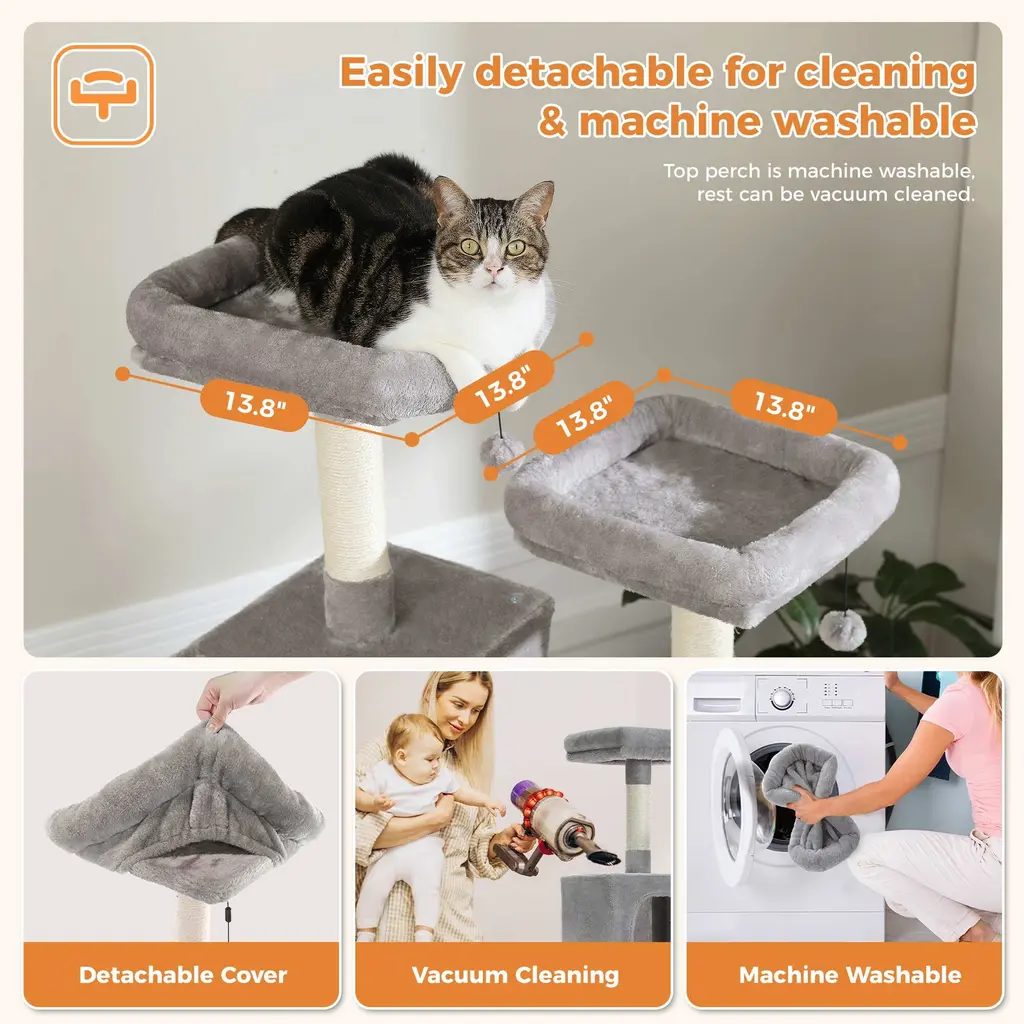 [Perfect for Multi-cat Households]: This large cat tree has more resting spots and can accommodate up to 4-5 small and medium-sized cats at the same time. Two extra-large top perches and a large fluffy cat hammock provide ample space for your fat kitties to stretch and snooze. They can also enjoy batting around the dangly toys or gazing at birds outside the window. Additionally, a spacious fluffy cat condo offers a cozy hideaway for cat naps, covered in plush fabric for ultimate comfort.[Safe Enjoyment of Fun]: This large cat tower with an anti-toppling kit for ensuring Safety and Stability. Additionally, the robust structure and large, thick base provide extra stability for your little cat's secure climbing. Solid particle board guarantees exceptional durability, while the high-quality plush material offers a gentle and comfortable experience. Moreover, the scratching boards and scratching posts are covered with 100% natural sisal, fulfilling all scratching needs.[Easy to Clean]: The removable cover on top of the cat perch makes cleaning a breeze (pro tip: it's machine washable!). Covered in plush fabric, this cat stand can be easily cleaned with a vacuum cleaner, ensuring a clean and inviting resting place for your beloved cats.