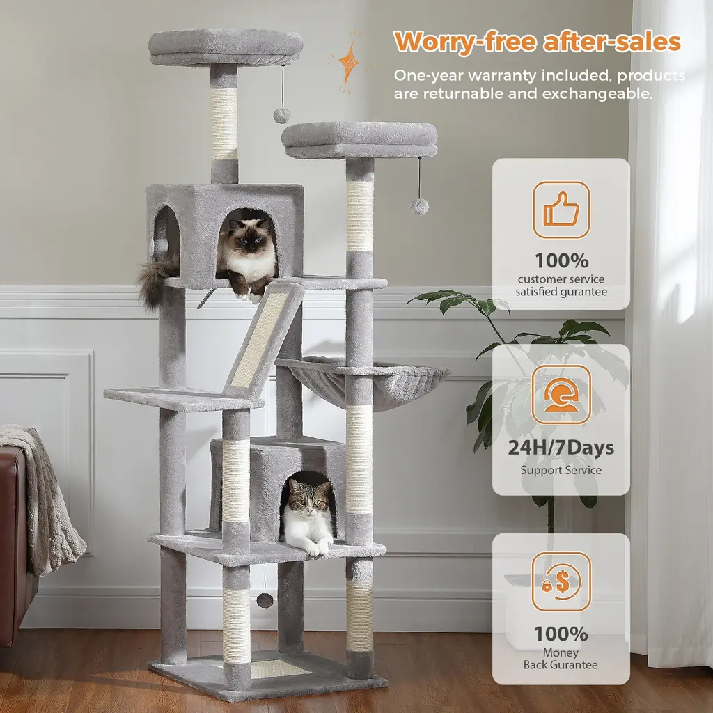 Multi-Level Indoor Large Cat Tree Scratching Post With 2 Perches, 2 Condos, Hammock And 2 Pompoms - Grey