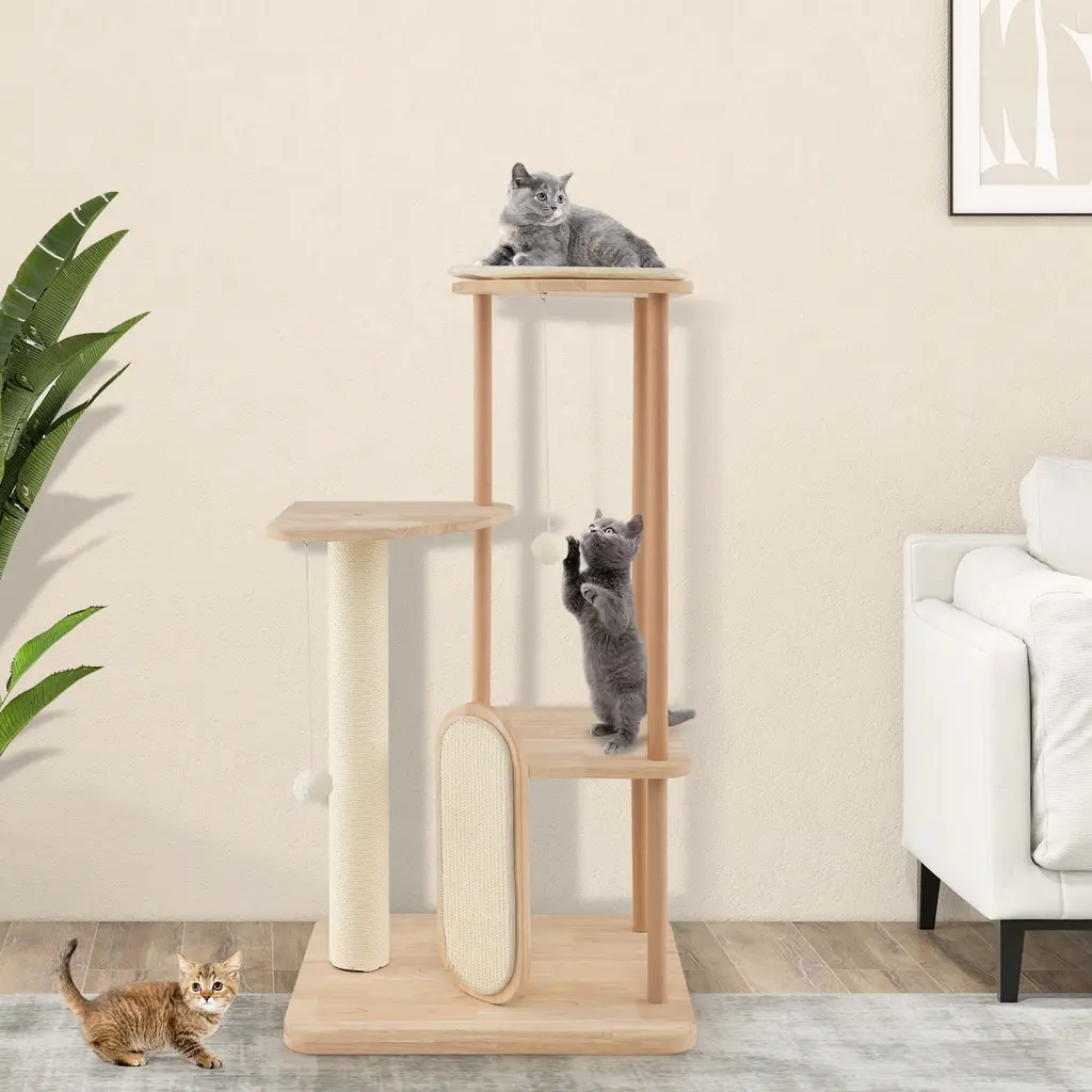 Specifications:Key Features:● Versatile Kitty Playground: Equipped with a padded perch, your furry companions can observe the outside world and enjoy a cozy nap. Additionally, the cat tree features 2 platforms for your beloved cats to exercise and play. And the interactive hanging toy will keep your cats entertained for hours.● Meet Cats' Natural Instincts: Coming with a scratching board and scratching post, The wooden cat tree will allow cats to scratch claws for years and protect your furniture. Crafted from high-strength and solid paper rope, the wood cat tree allows your cats to scratch to their heart's content.● Durable Wooden Structure: Crafted with premium rubber wood, the modern cat tree features excellent sturdiness and crack-resistance for lasting use. And the cat tree tower is supported by beech post for added stability. Moreover, the wide base is thickened to prevent the cat tree from tipping over.● Minimalist and Stylish Design: Featuring natural wood style, the cat tower for indoor cats can easily complement with various home decor themes. Measuring 23" x 18.5" x 44"(L x W x H), it is also an economical solution for small apartments and spaces.● Maintain with Ease: To ensure a longer lifespan, the cat tree can be effortlessly cleaned with a wet cloth. Besides, the removable mat provides a warm and cozy experience for your cats and is machine washable, making maintenance a breeze.