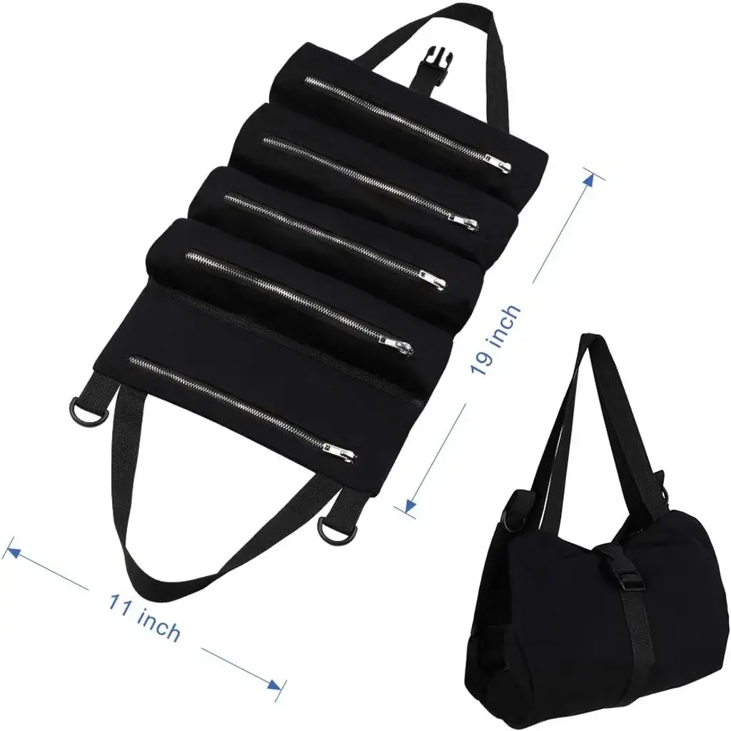 【PREMIUM MATERIAL】Made out of waterproof 600D oxford cloth, wear-resisting and durable, this tool roll up bag is easy to roll up for daily carrying or hanging on your car back seat. 【5 ZIPPERED POCKETS】There are 5 divisional zipper pockets that will store a variety of small pillars, screwdrivers, sockets, tire gauges, or flat tools. It’s more secure and you never worry about losing. 【KEEP ORGANIZED】The NEX tool roll is super convenient for you to store all your tools and keep them organized, allowing you quickly and easily accessible for tools & small accessories 【PRODUCT DIMENSION】Unfold size: 19-in x 11-in. Shipping weight: 0.95 lbs. This multi-functional tool roll up pouch can be used as a pouch sling, pouch roll, and car camping gear essential case.