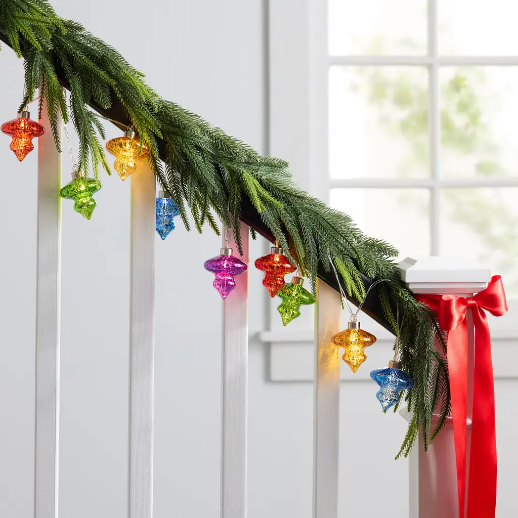 Our traditional string lights showcase 10 mercury-glass ornaments topped with silver caps and filled with LED lights that make each bright color glow. Inspired by vintage designs, these Christmas decorations take their cue from classic finial ornaments of the '60s. Strung on flexible wire, you can hang, drape, or wrap our bestselling battery-operated lights to dress up windows, fireplace mantels, tabletop displays, and more!