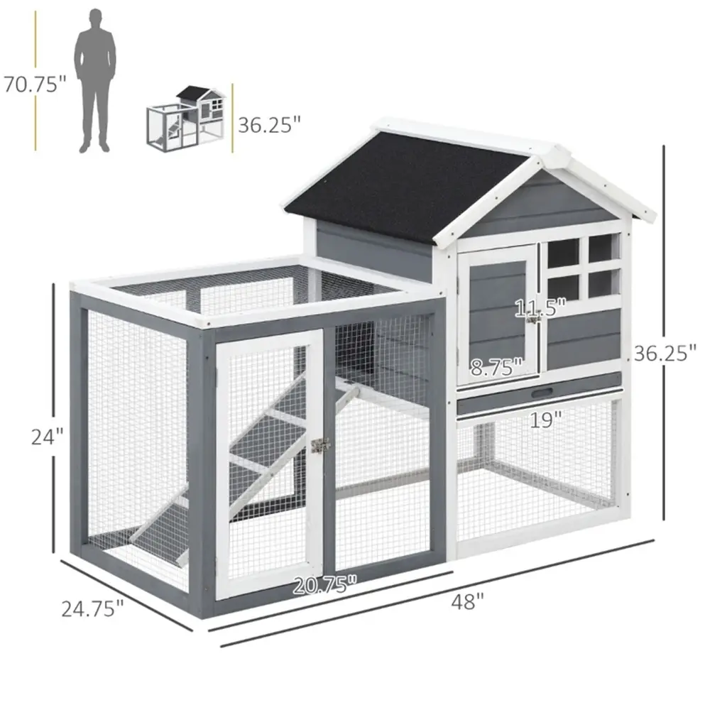 Specification:Description:This rabbit hutch with an outdoor run is the perfect home for rabbits, bunnies, and other small animals. Constructed from durable solid fir wood, it offers superior strength and long-lasting reliability. The multiple door design ensures easy access, while the heavy-duty wire secures your pets inside and keeps unwanted animals out. A convenient ramp allows for smooth access between the upper and lower levels of the hutch and outdoor area. The top slanted roof is covered with asphalt, providing added protection against the elements. For easy cleaning, the hutch includes a slide-out tray. Suitable for 1-2 rabbits, this hutch requires assembly.Key Features: