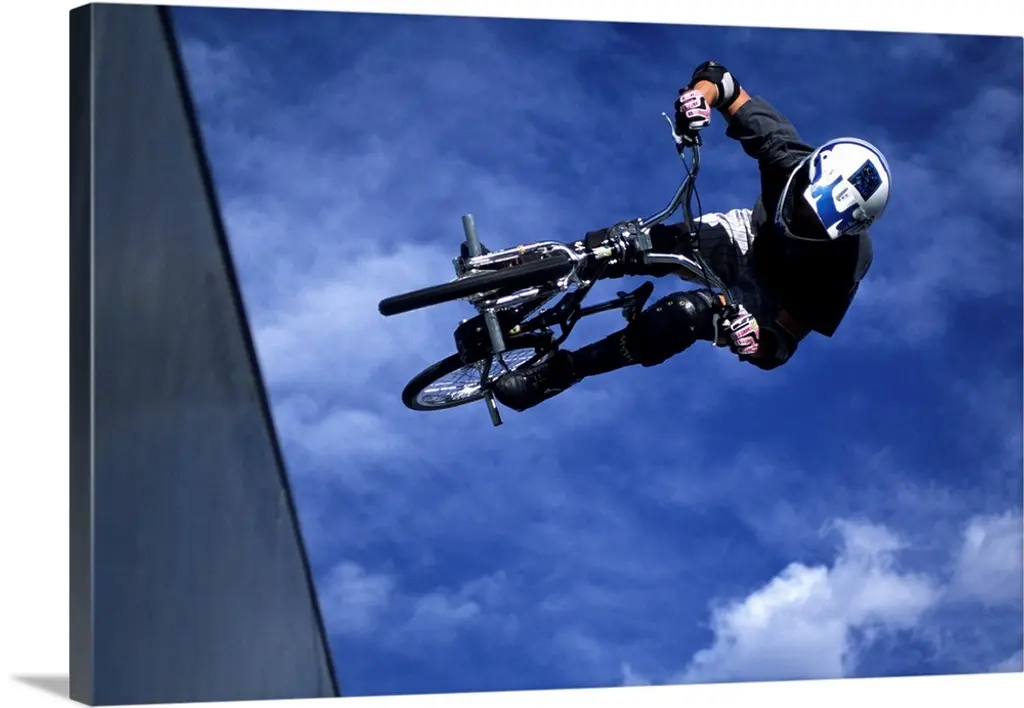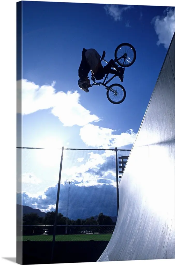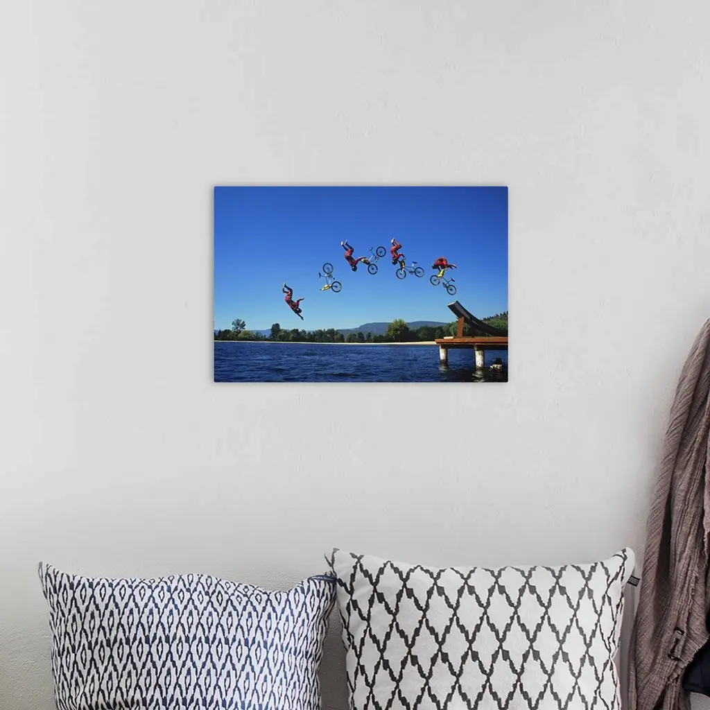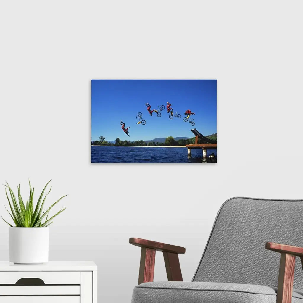 Multiple exposure of cyclist going off jump into water