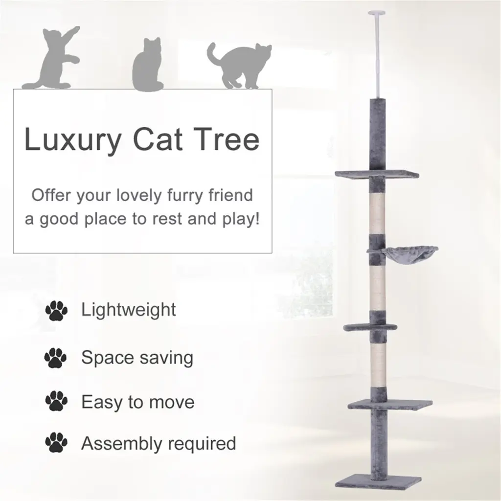 Specifications:Description:This grey cat tree is designed with multiple platforms, providing ample space for your feline friends to relax and play. Constructed from durable P2 grade particleboard and covered with 220gsm short plush fabric, it offers a stable and comfortable environment for your pets. The tree stands at an adjustable height of 90.5” to 102.25”, and can be safely secured to the ceiling with the included tension rod. It features a 3.5" diameter paper tube for extra stability, and encourages healthy scratching behavior, allowing your cat to shed nail sheaths. Easy to assemble, this sturdy cat tower is perfect for cats who enjoy climbing and scratching. Designed for ceilings under 102.25 inches, assembly and ceiling attachment are required for enhanced safety.Key Features:
