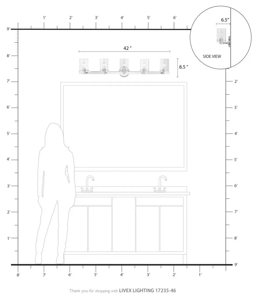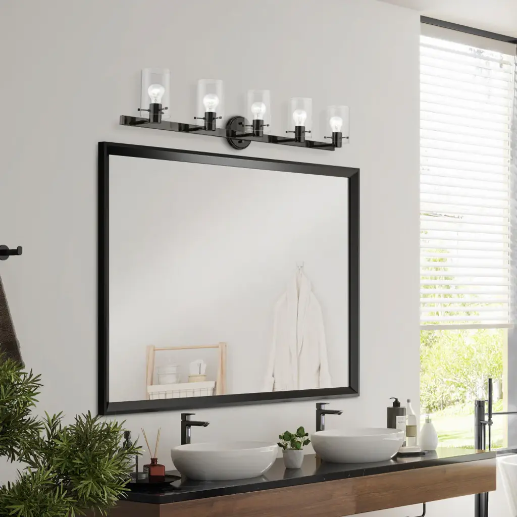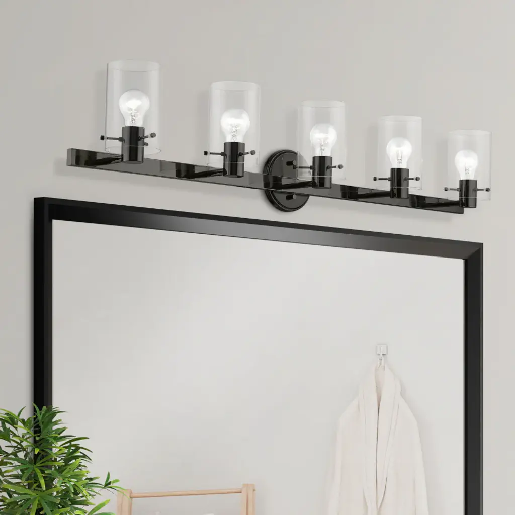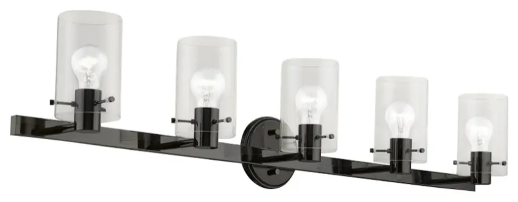 The Munich transitional five light vanity sconce will bring posh sophistication to your decor. The backplate and clear cylinder glass give this polished black chrome finish a sleek, contemporary look.Bulb Wattage: 60Number of Bulbs: 5Type of Bulb: Medium BaseBulbs Included: N