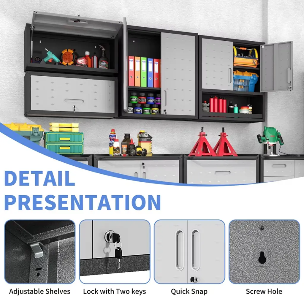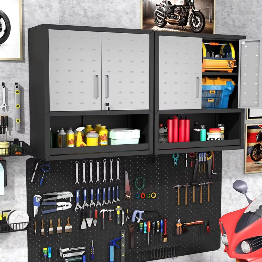 This Munora wall-mounted garage cabinet combines security and versatility for organized tool storage. The black/grey steel unit (11.81"D x 29.53"W x 30.31"H) features 18-gauge cold-rolled steel construction with a dual-tone powder-coated finish, resisting rust and wear in garage, basement, or utility room environments. Two lockable doors (with two keys included) safeguard tools, while two adjustable interior shelves (1" height increments) and one fixed open shelf adapt to varying item sizes. The open shelf beneath the cabinet allows quick access to frequently used tools, and the top surface provides additional storage. Pre-drilled mounting holes enable 15-minute installation with the included hardware and tools. Shipped with a 1-year warranty, this cabinet optimizes wall space while delivering industrial-grade durability in a modern two-tone design.