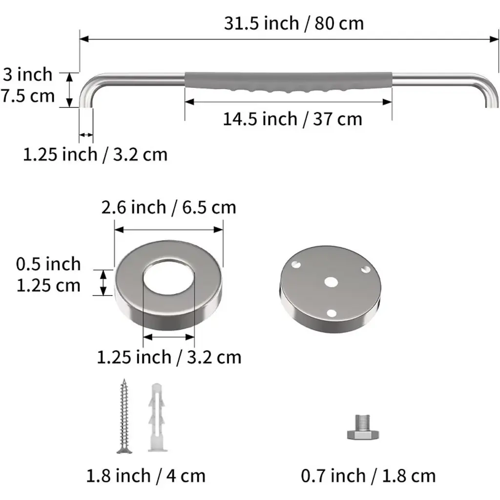 MUNZONG 32in Chrome Shower Grab Bar w/ Gray Anti-Slip Rubber Grip 2-Pack the non slip knurled surface on middle is superior for safety when you have soapy hands and need to steady yourself. Munzong 36 inch knurled surface bathroom shower grab bars 1.25 inch diameter are able to support up to 500 lbs of pull force to provide a stable, reliable handhold. Made of anti-rust stainless steel for a lasting strength and quality. Concealed screw in secure wall mount design allows for easy, secure installation at any angle, allows you to cover any unsightly screw holes and continue a clean, sleek trend to your bath and shower. Use 36 inch anti slip knurled safety grab bars in the bathroom, kitchen, along stairways, or in the laundry room for additional fall prevention, especially for the handicap, elderly, pregnant women, and children. Not only apply to use as bath shower grab bar, but also can hold clothing, etc. Handicap grab bars for bathroom.