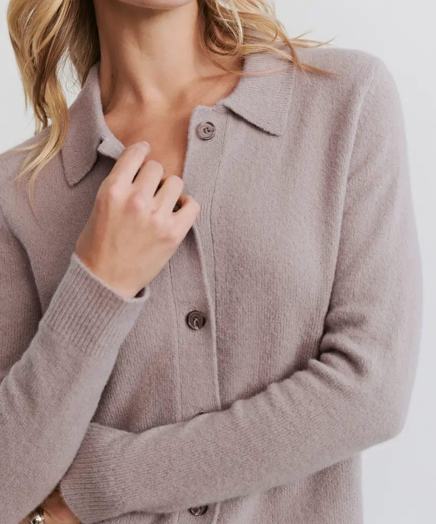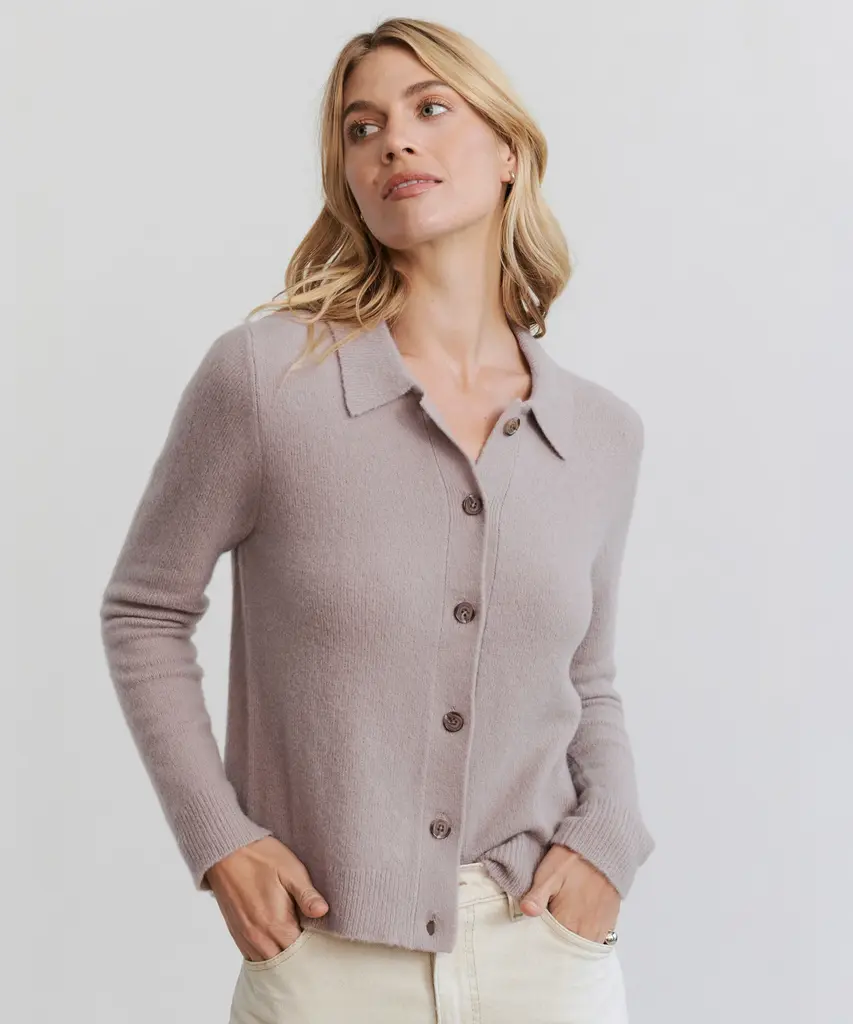 Murphy Cardigan Mauve This ultra-soft and buttoned-up knit combines comfort with luxury effortlessly. 80% cashmere, 18% polyamide, 2% elastane. Made in China. Classic, fitted sweater with collar.