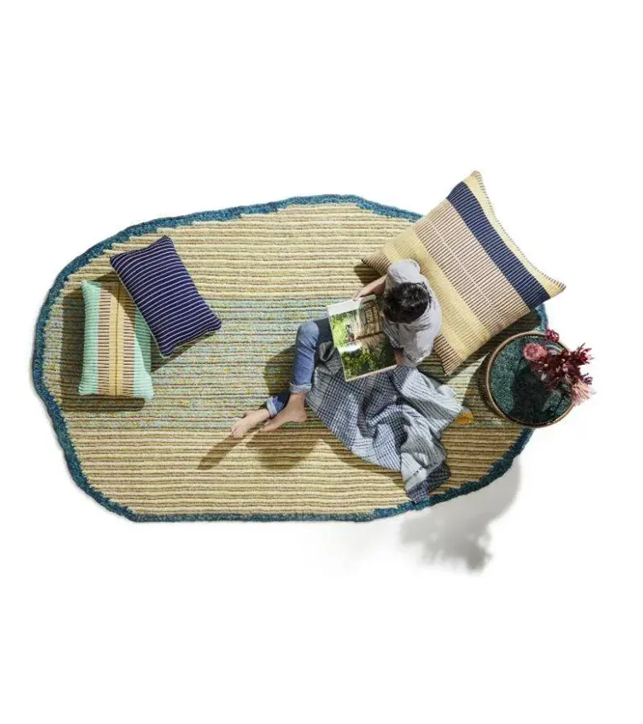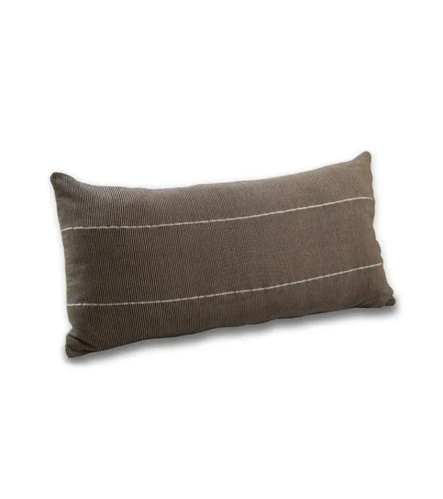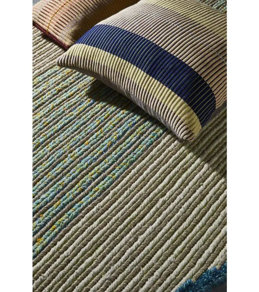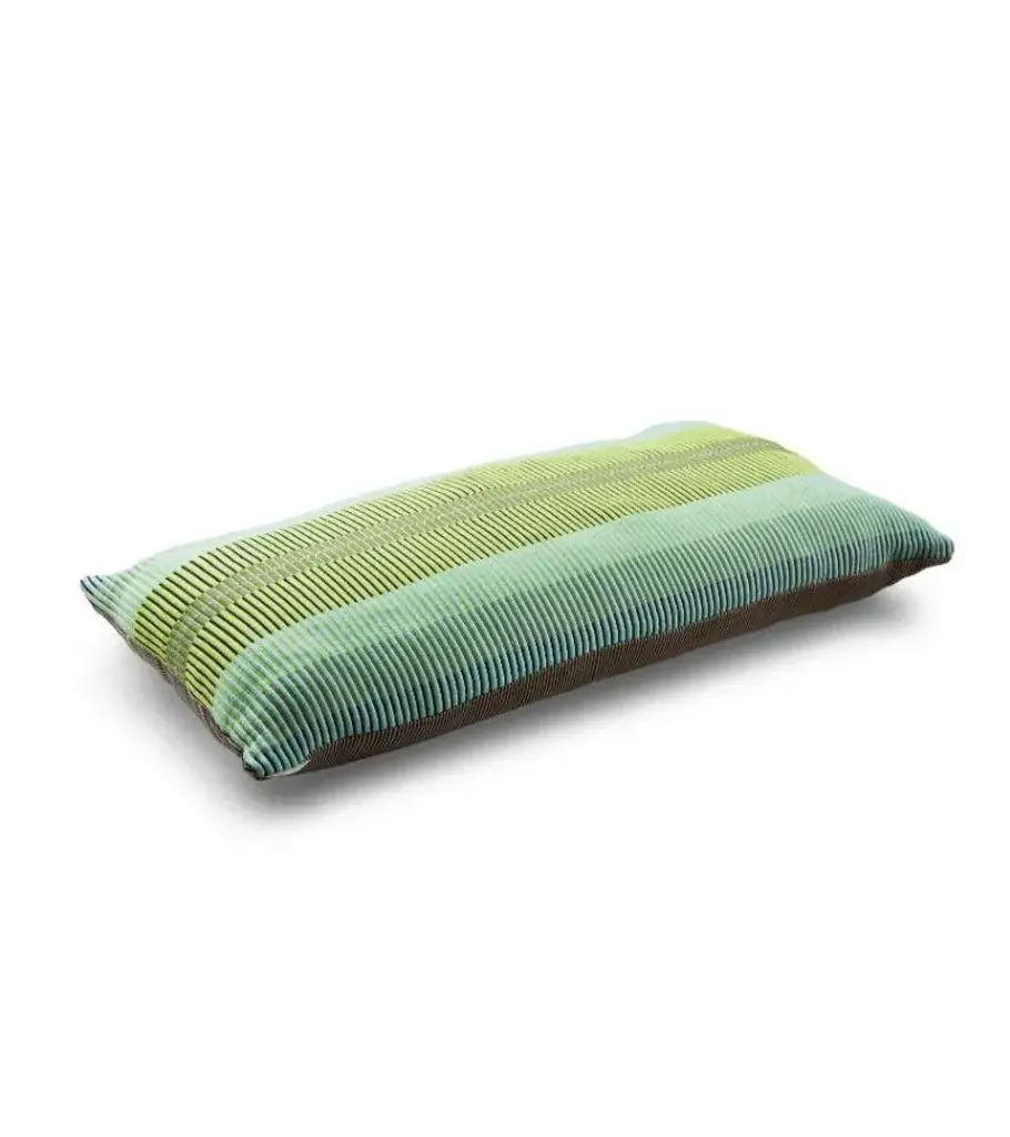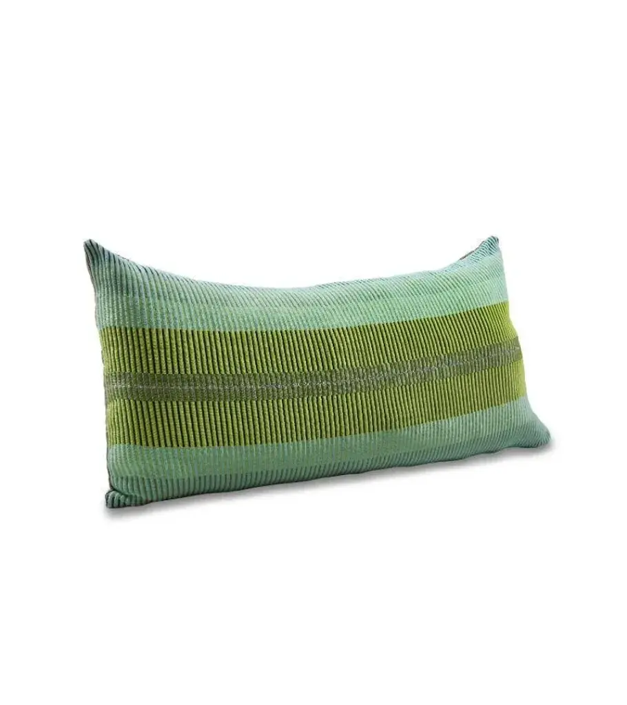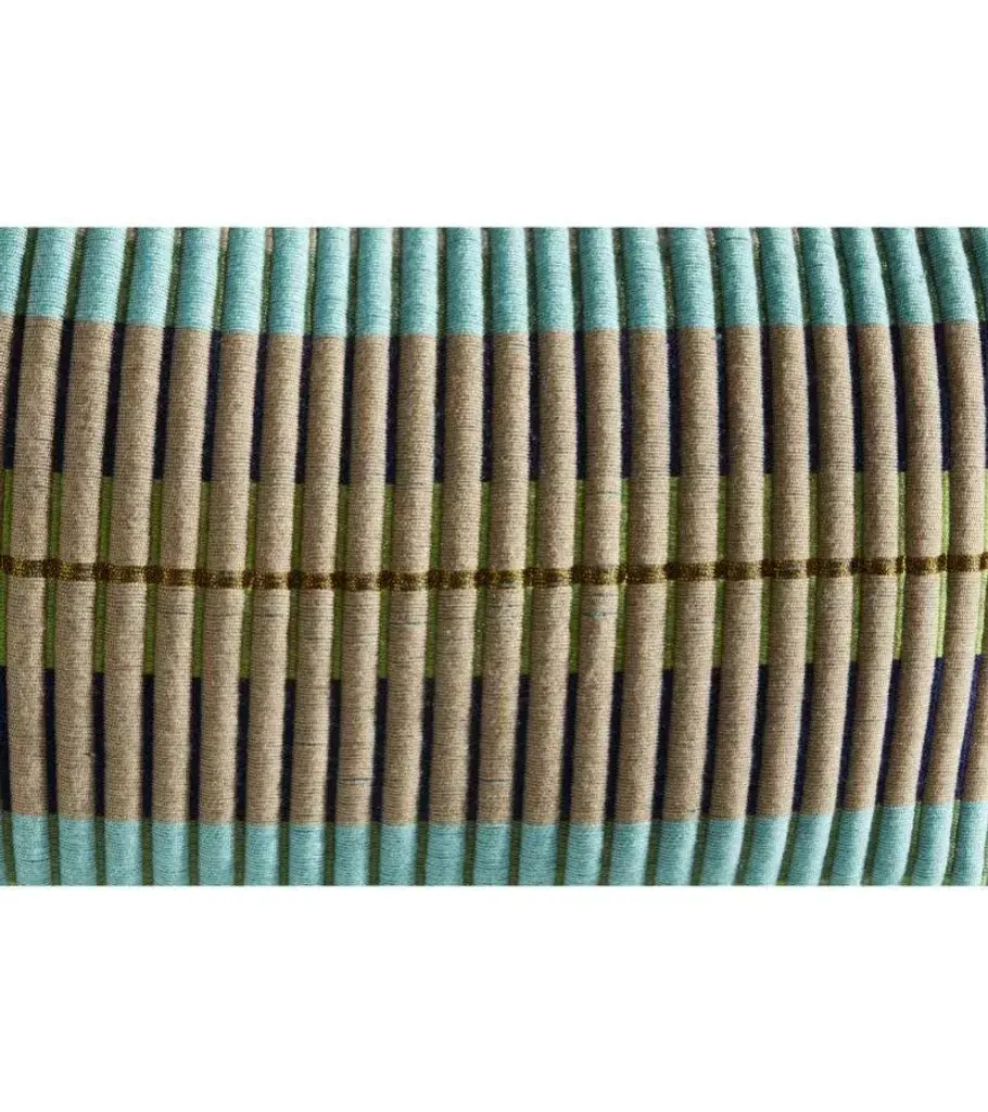 Musgo Chumbes Layer cushion by Mae Engelgeer. Materials: 100% Cotton. Technique: Hand-woven in Colombia. Dimensions: W 160 x H 80 cm Available in colors: musgo/banana/silver/pasto. Also available in sizes: Medium, Large, and Cylinder Pillow. The Chumbes Cushion is a sumptuous accessory created by Dutch textile designer Mae Engelgeer. A lively addition to any sofa or lounge chair, its very intricate stripe pattern is inspired by the Chumbe Inga, a traditional Colombian garment. The cushion features two different hand-woven motifs that have a ribbed structure, making it a joy to touch. Thanks to the metallic threads that have been woven into the cotton, the cushion has a gentle lustrous shine. The Chumbes collection also includes a cylinder cushion and a large layer cushion. Each cushion is hand-woven in our partner workshops in San Jacinto, a municipality in the North of Columbia. Similar to the production of the hamacas, which are typical for the region, it is the artesanas, the craftswomen, who produce the textiles on vertical looms. It takes up to ten days for the women artisans to produce one cushion.