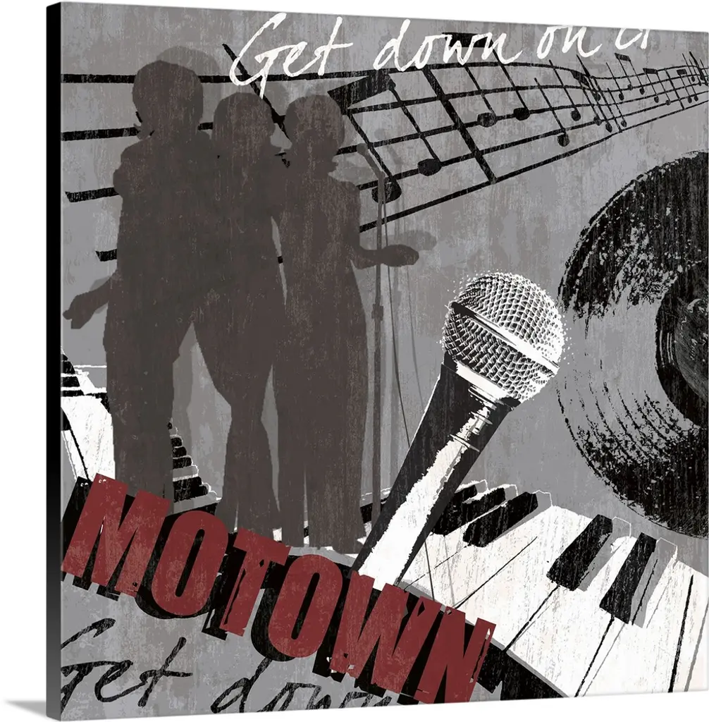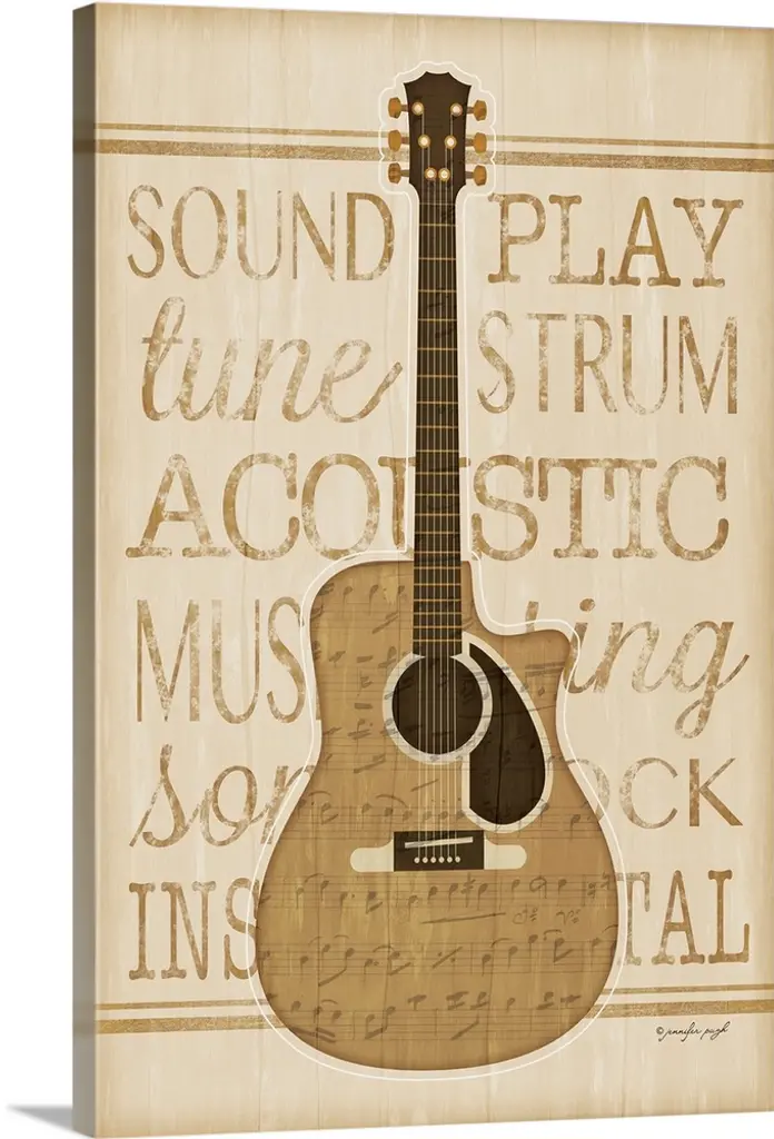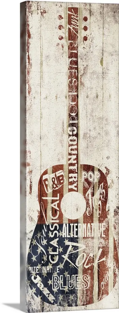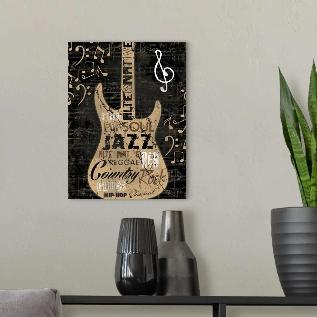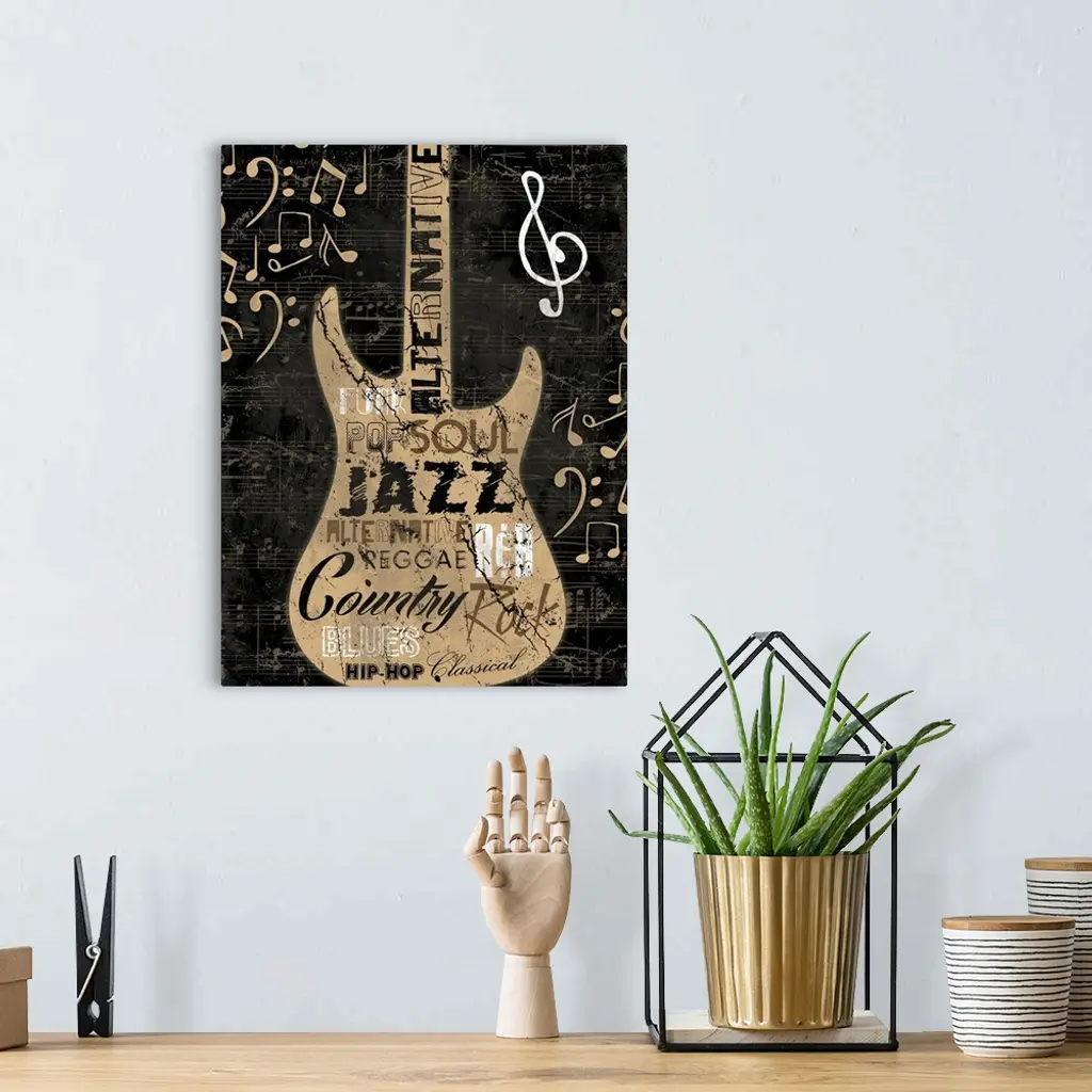 Rustic stenciled guitar with genres of music in the outline of the guitar. With music notes in the background.